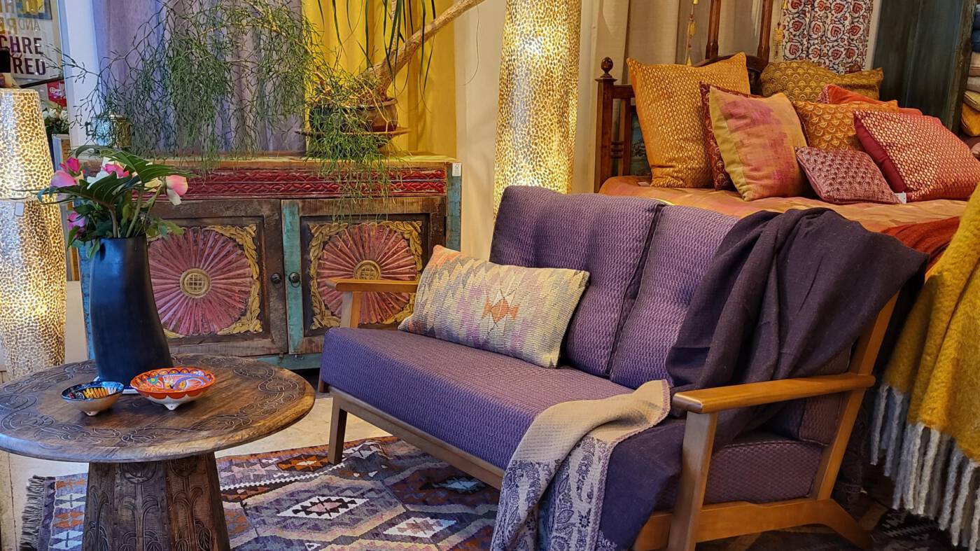 "Schitterende bank en kussens van Ochre and Red met kleurrijk kleed."