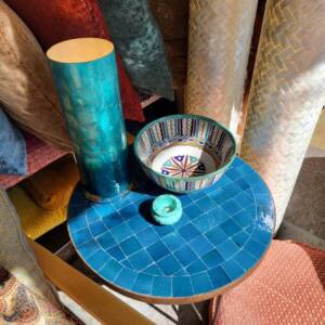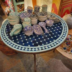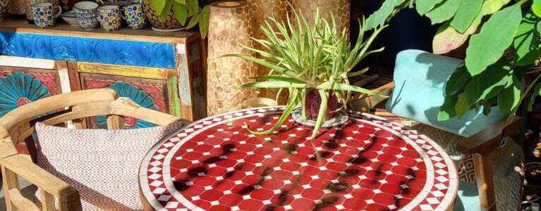 Het mozaiektafel seizoen is weer begonnen! Voor een gezellig zitje buiten en goed te combineren met een aantal authentieke teakhouten kappersstoelen uit India.
