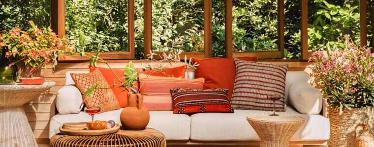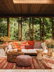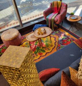 Sfeervolle woonruimte met een kelim, kussens en plaids, lamp, tafels en blockprinted poef.