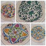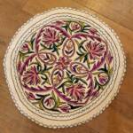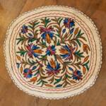 De bergachtige streek waar deze artikelen gemaakt worden, leent zich uitstekend voor het houden van schapen en geiten. Zo zijn er in de loop van de tijd veel wollen producten onstaan. Niet alleen zijn zij meesters in het bewerken van dit materiaal, maar juist het toepassen van diverse borduurtechnieken heeft het handwerk in Kashmir een geheel eigen signatuur gegeven. Alles daarvan is terug te vinden in de mooie omslagdoeken, stoffen en vloerkleden die zij vervaardigen. Voor deze collectie hebben we gekozen voor een rond formaat kleed van ongeveer 80 cm in doornede. Ze zijn stuk voor stuk uniek en kosten € 39,- per stuk.