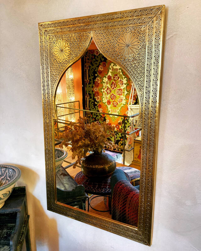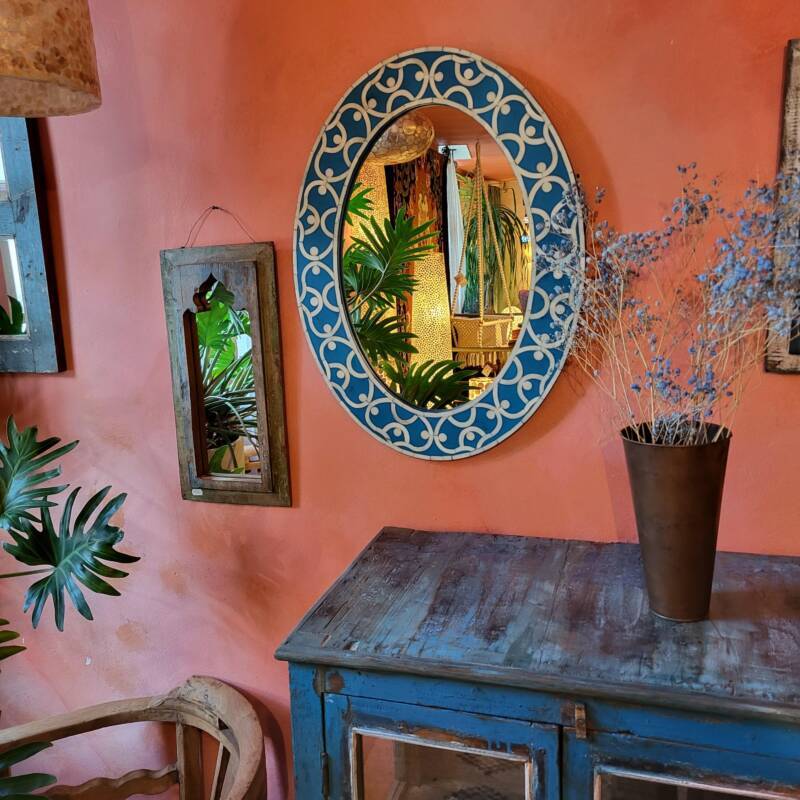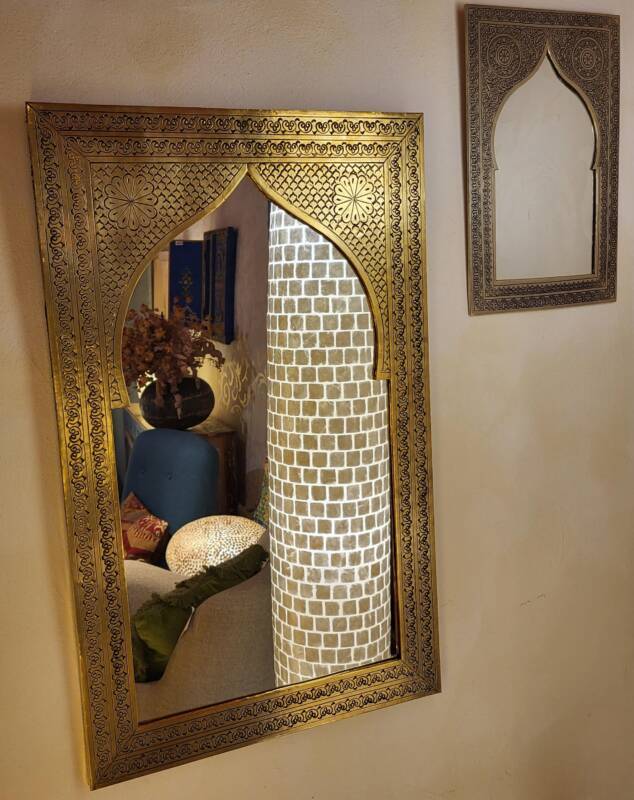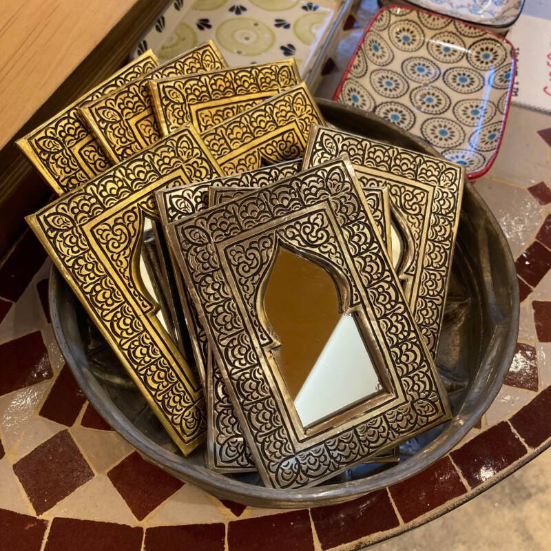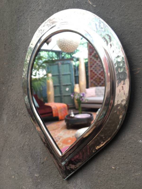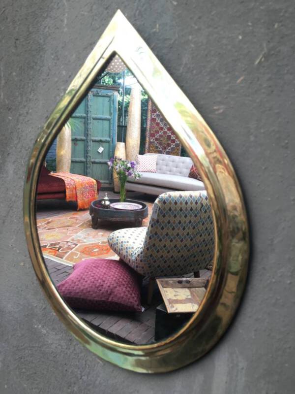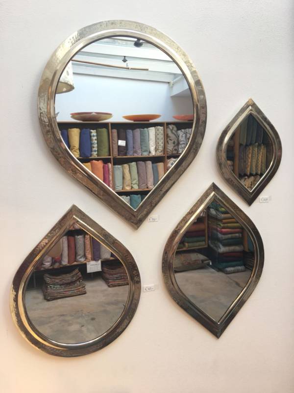 Daarnaast verkopen we een serie spiegels uit Marokko, de ene is traditioneel met beslagwerk en ingegraveerd patronen, de andere oogt meer modern en is verkrijgbaar in 3 vormen oog, druppel en rond. Beide series zijn leverbaar in messing en nikkelkleur en in verschillende formaten.