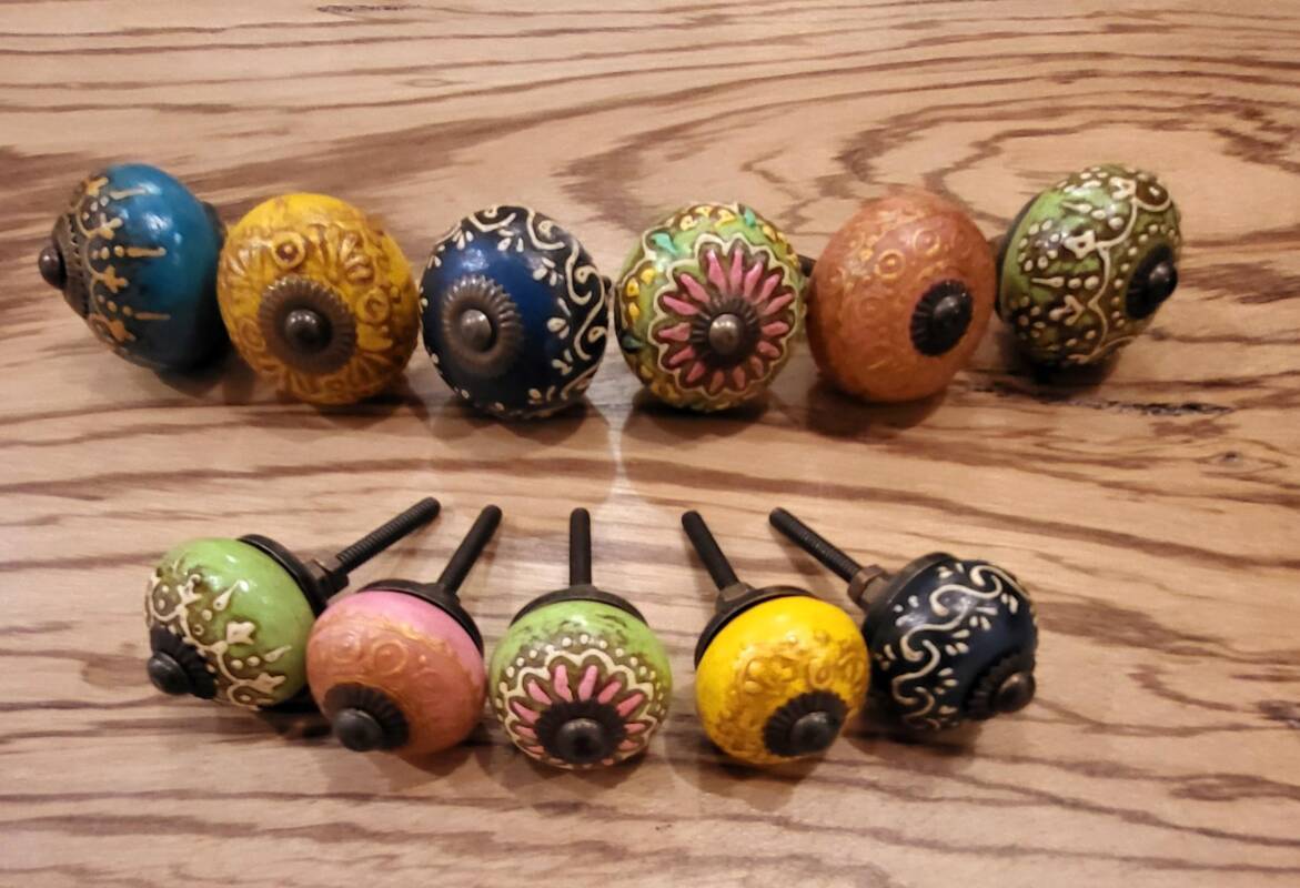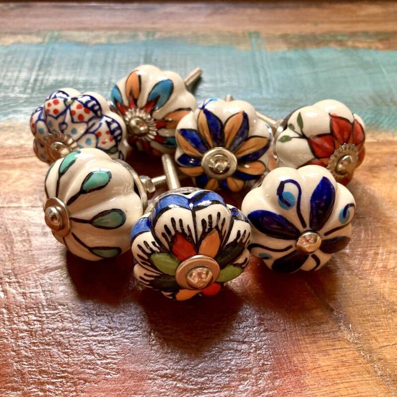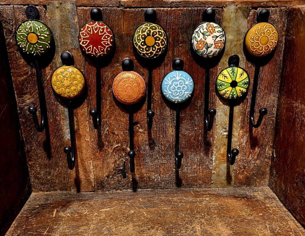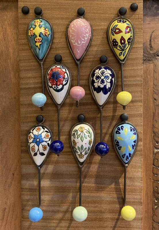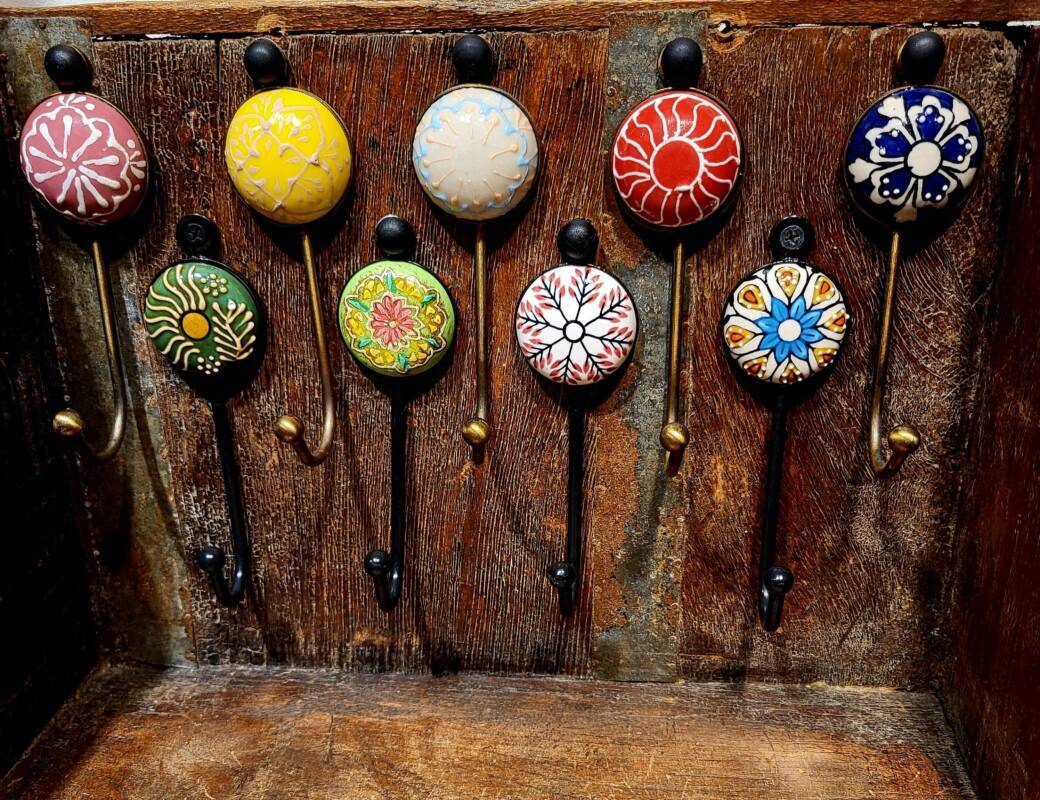 Naast bovenstaande deurknoppen, zijn er ook handbeschilderde haakjes en hendels verkrijgbaar.