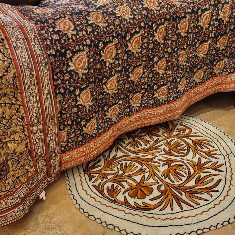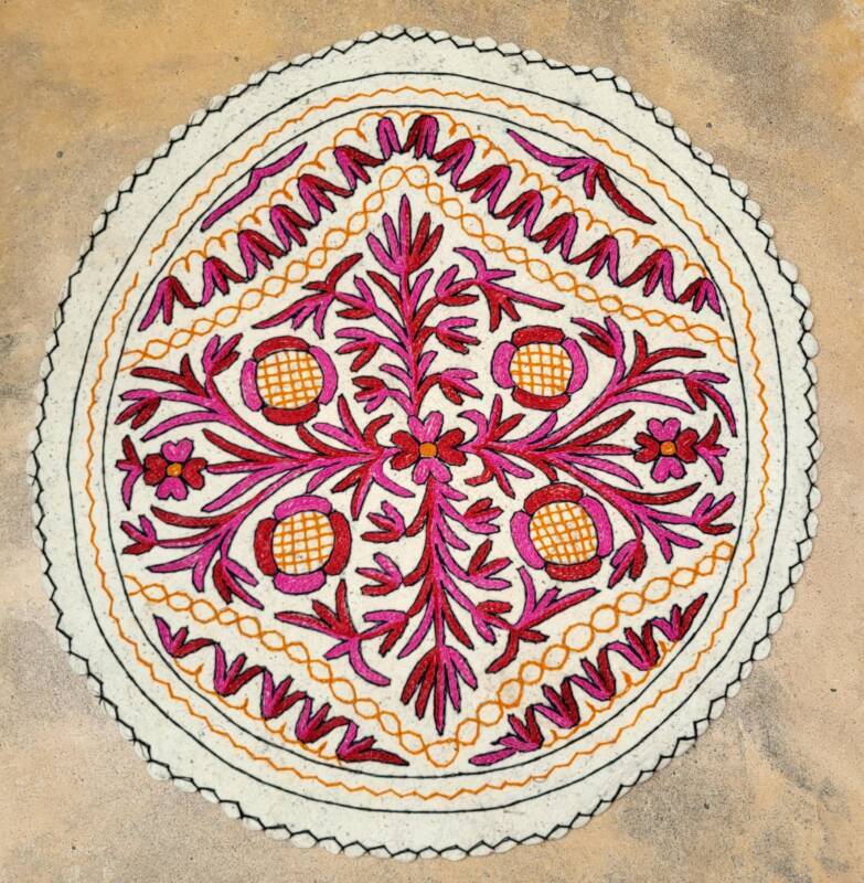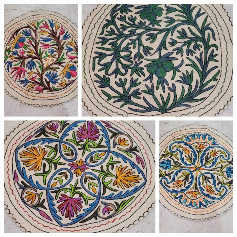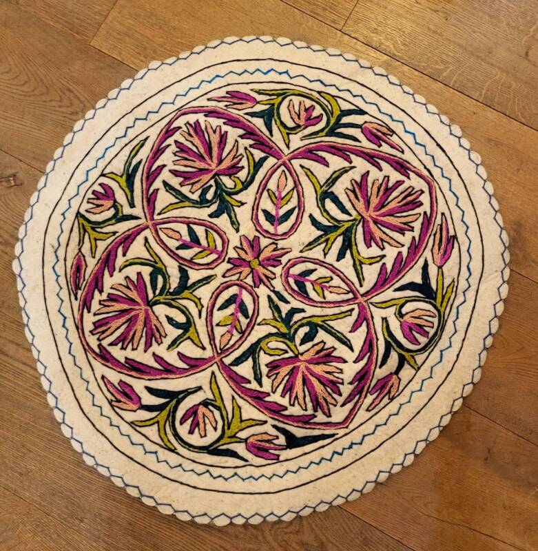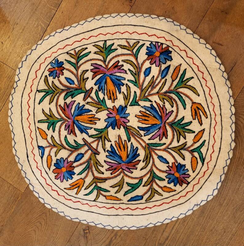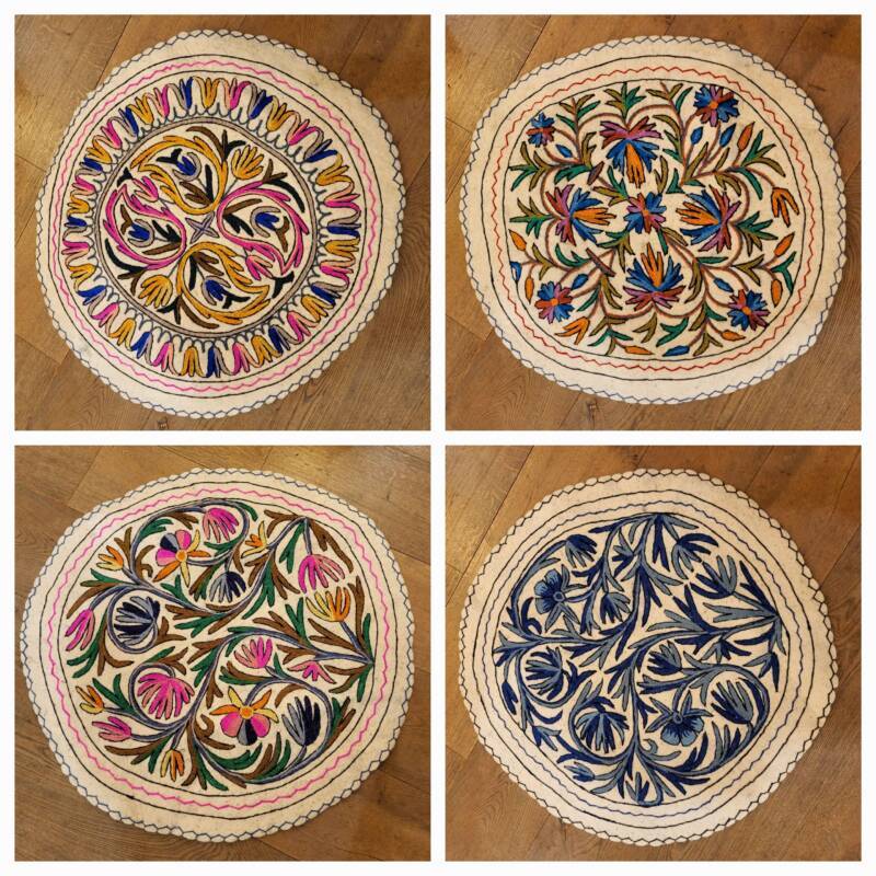 De bergachtige streek waar deze artikelen gemaakt worden, leent zich uitstekend voor het houden van schapen en geiten. Zo zijn er in de loop van de tijd veel wollen producten onstaan. Niet alleen zijn zij meesters in het bewerken van dit materiaal, maar juist het toepassen van diverse borduurtechnieken heeft het handwerk in Kashmir een geheel eigen signatuur gegeven. Alles daarvan is terug te vinden in de mooie omslagdoeken, stoffen en vloerkleden die zij vervaardigen. Voor deze collectie hebben we gekozen voor een rond formaat kleed van ongeveer 80 cm in doornede. Ze zijn stuk voor stuk uniek en kosten € 39,- per stuk.
