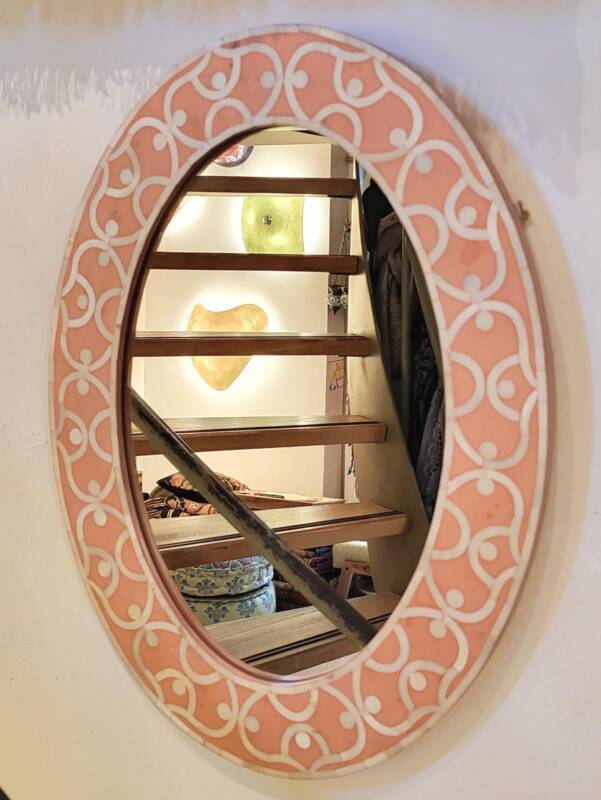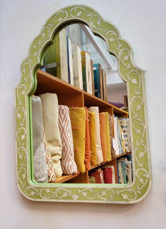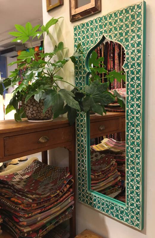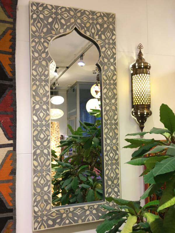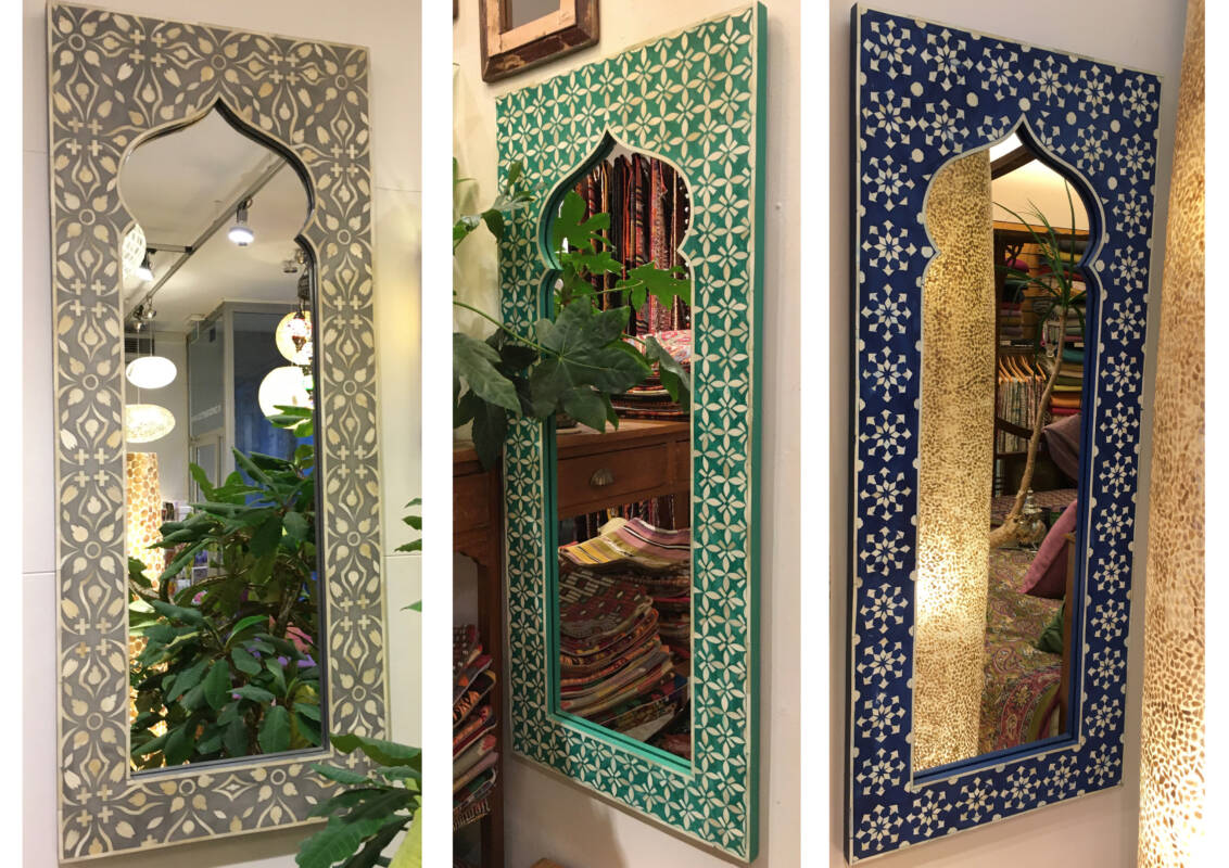 We hebben een hele bijzondere serie spiegels gemaakt van been- inleg werk. Deze worden in Udaipur gelegen in de provincie Rajasthan in India gemaakt. Het bewerken van been is een mooi oud ambacht. Voordat plastic zijn intrede deed werden zeer veel gebruiksgoederen en objecten van deze materie gemaakt (zoals kammen, doosjes, bestek, etc.) Het kan makkelijk beschilderd of ingekleurd worden, van origine en na het polijsten heeft het een ivoorachtige uitstraling.