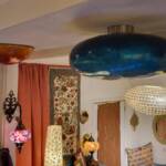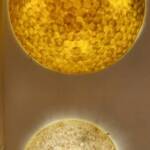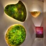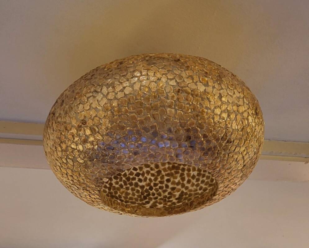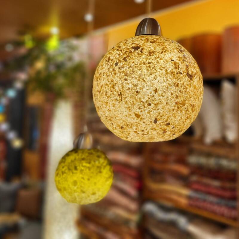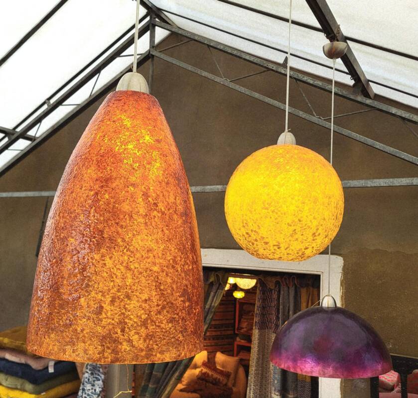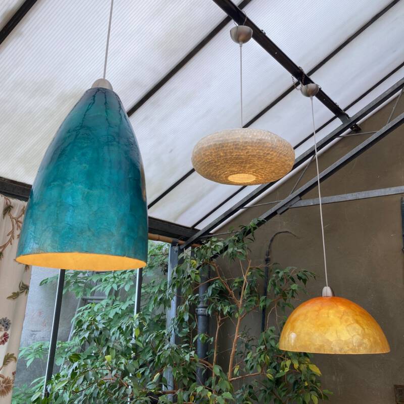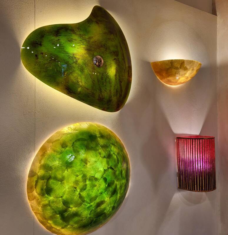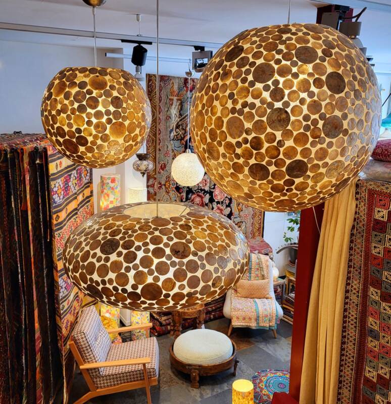 Een grote variatie aan staande en hangende lampen gemaakt van stukjes schelp op een basis van kunsthars, behoort tot de vaste collectie. Ze worden vervaardigd in Indonesië, verspreiden een neutraal diffuus licht en passen bij allerlei interieurstijlen. Het ongepolijste materiaal geeft het de mooie handgemaakte uitstraling. Door de organische vormen voegen ze zich gemakkelijk, zodat deze objecten prima in een hoek, naast een kast of bij de bank te plaatsen zijn. Deze lampen zijn ook al ze niet branden mooie sfeermakers.