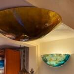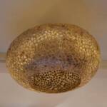 Onze kleurrijke schelpenbollen komen uit de Filipijnen. Deze lampen zijn tevens gemaakt van kunsthars met parelmoerschelp en verkrijgbaar in drie maten en wel 12 verschillende kleurvariaties. Voor een kleine “gladde” bollamp (15 cm ø) betaald u €39,50 en de middenmaat (25 cm ø) kost €65,-. De grootste variant is 35 cm doorsnede en kost €99,-. Ook zijn er bollen met gouden of witte schubjes verkrijgbaar. Hiervoor betaald u €52,50 voor de 15 cm ø en €79,- voor de 25 cm ø variant. De grootste bol met schubben is 35 cm doorsnede en kost €125,-.