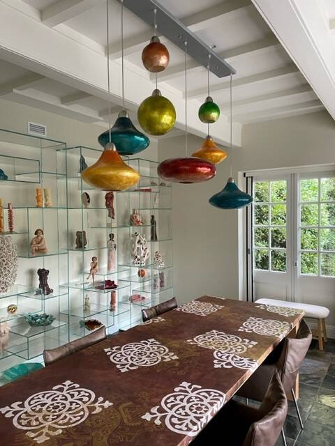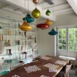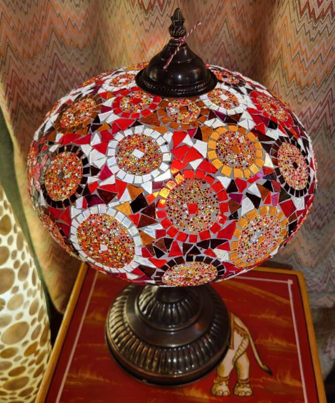 De grote staande koker lampen en bol gemaakt van stukjes gekleurd glas mozaïek ingelegd op een basis van fiberglas, worden gemaakt in Indonesië. Een modern kleurrijk accent geschikt voor allerlei ruimtes.