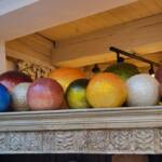 Onze kleurrijke schelpenbollen komen uit de Filipijnen. Deze lampen zijn tevens gemaakt van kunsthars met parelmoerschelp en verkrijgbaar in drie maten en wel 12 verschillende kleurvariaties. Voor een kleine “gladde” bollamp (15 cm ø) betaald u €39,50 en de middenmaat (25 cm ø) kost €65,-. De grootste variant is 35 cm doorsnede en kost €99,-. Ook zijn er bollen met gouden of witte schubjes verkrijgbaar. Hiervoor betaald u €52,50 voor de 15 cm ø en €79,- voor de 25 cm ø variant. De grootste bol met schubben is 35 cm doorsnede en kost €155,-.