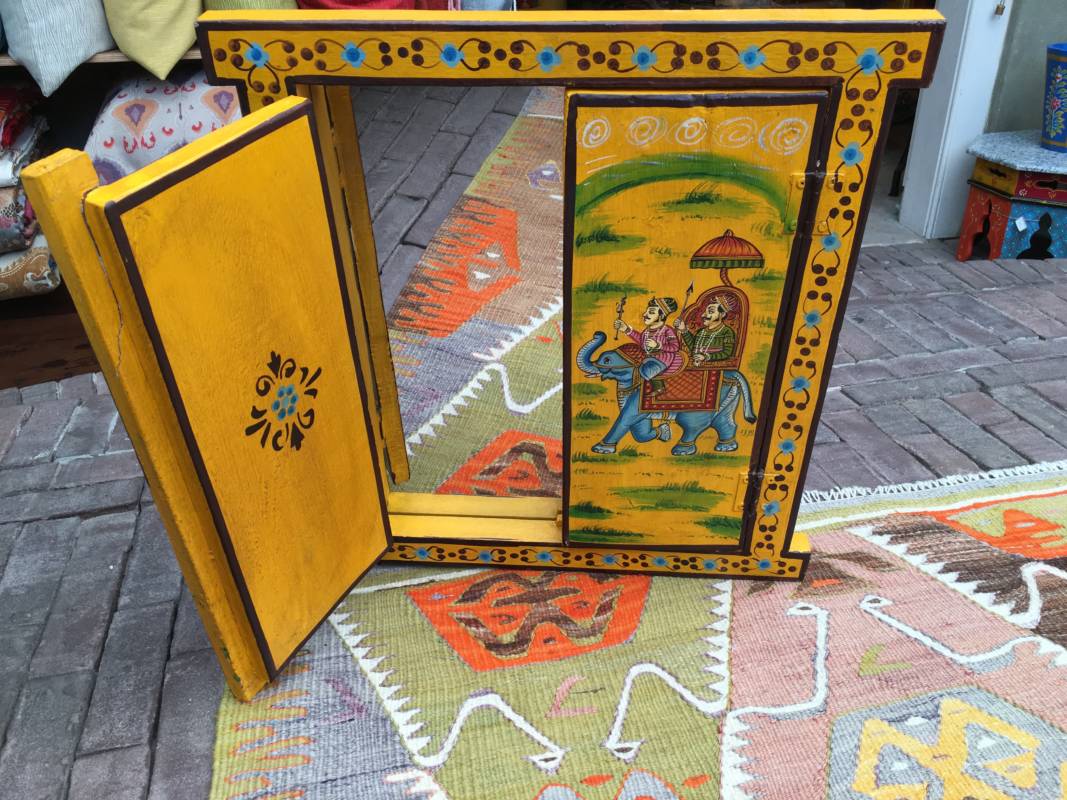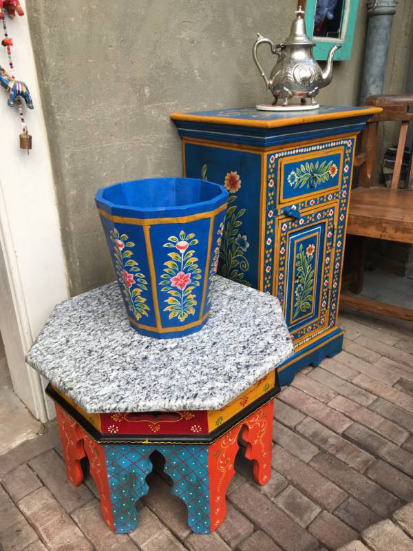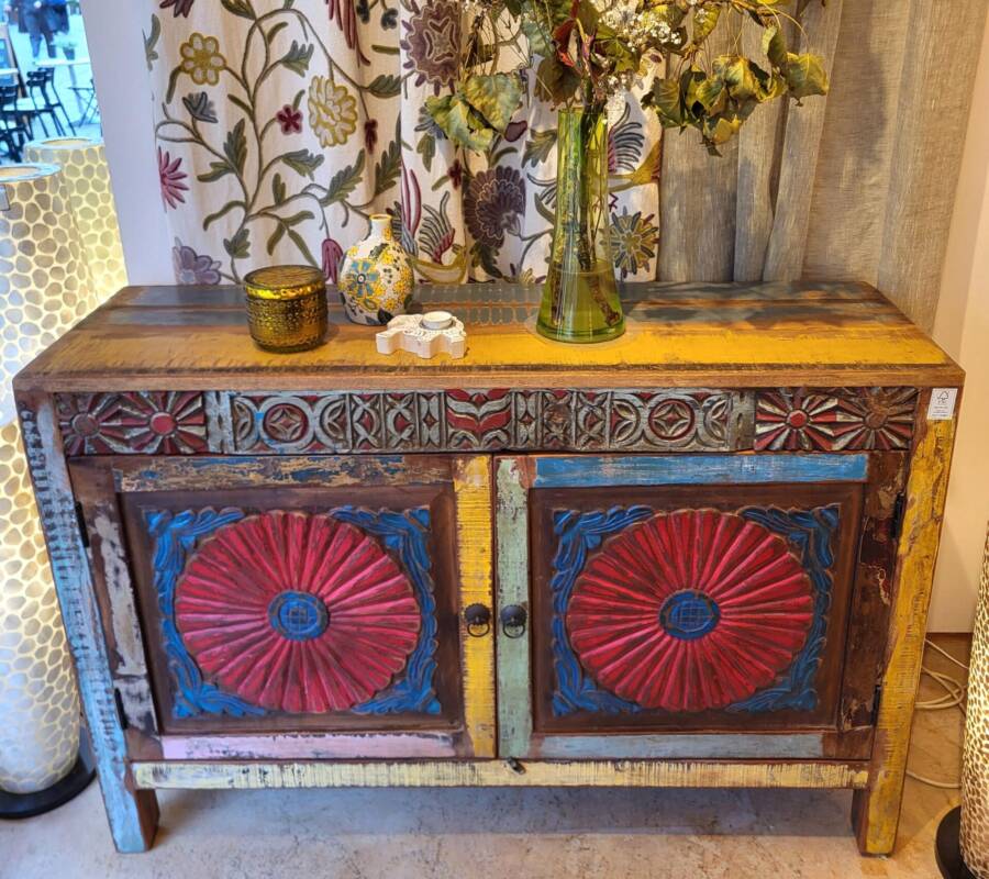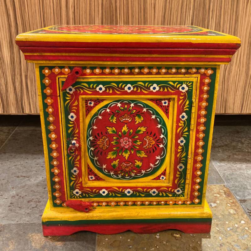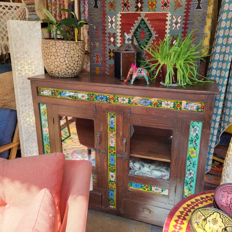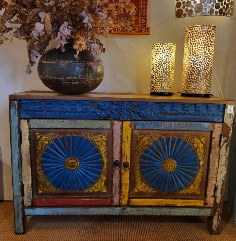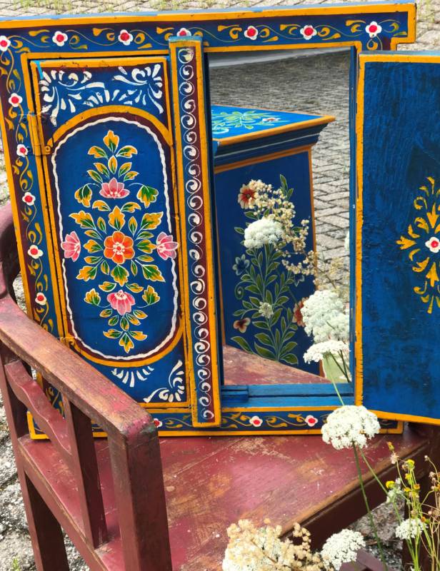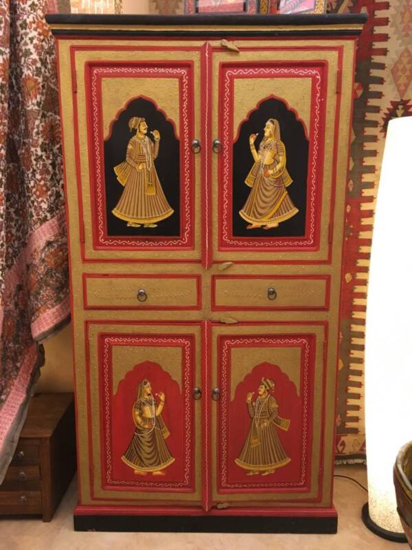Een eigenzinnig object in uw kamer zijn deze handbeschilderde kasten uit Jodhpur (India). Ze zijn overladen met traditionele schilderingen van bloemen, dieren en miniatuur afbeeldingen in diverse kleuren, gemaakt van stevig mangohout. Heel goed toepasbaar in de botanische sfeer met onze behoefte aan natuur. Naast deze kasten, zijn er ook luikspiegels, vazen, en tafels met een granieten blad in diverse kleurstellingen verkrijgbaar.