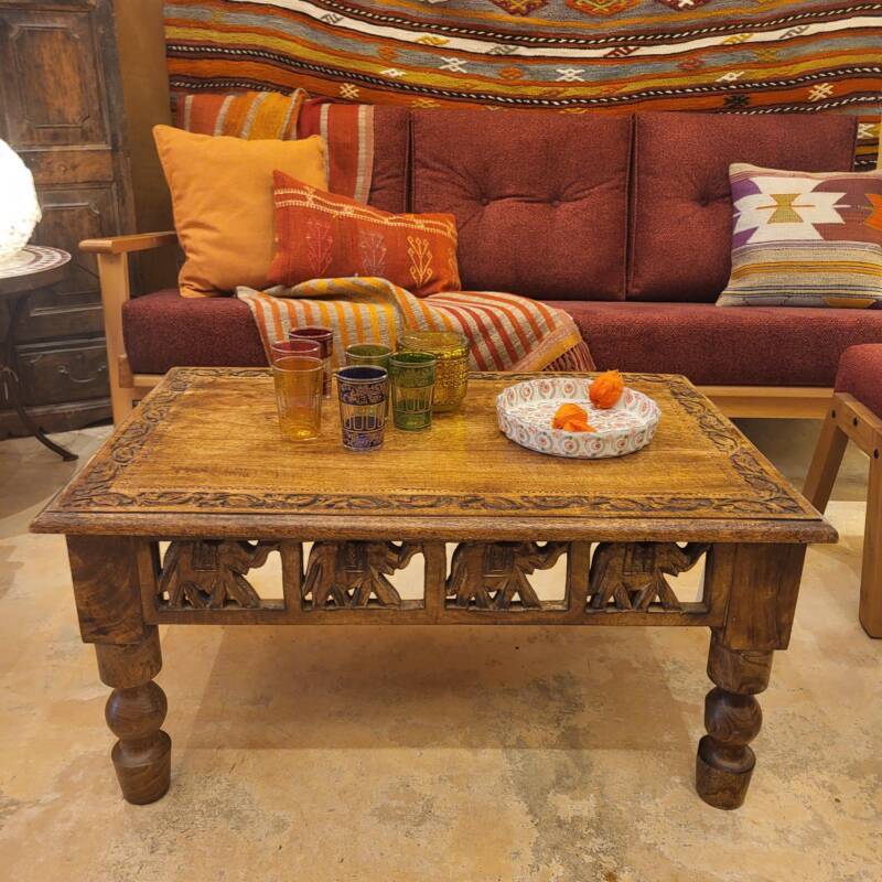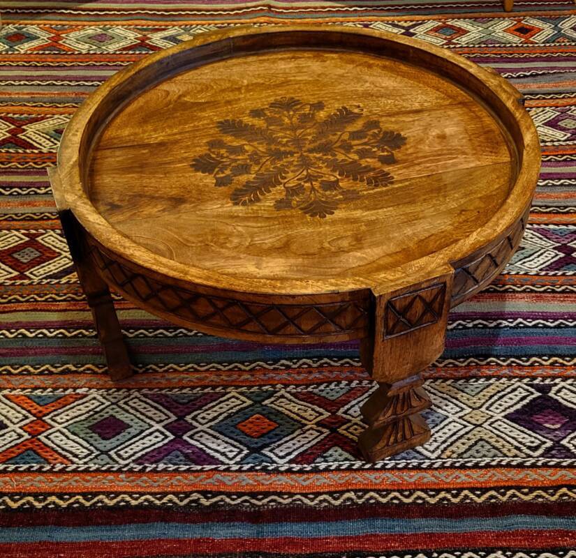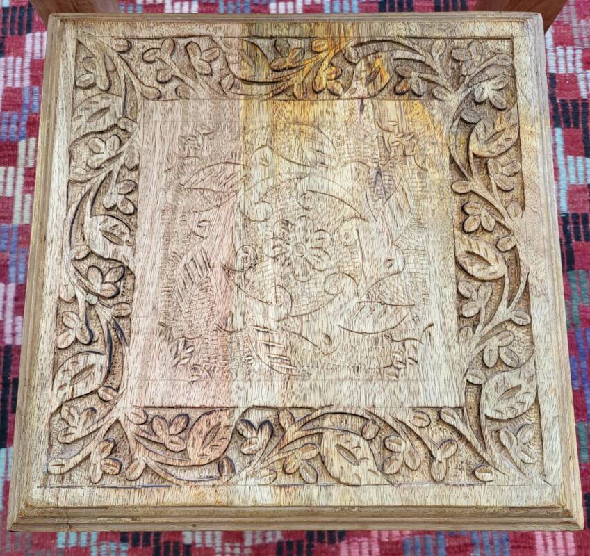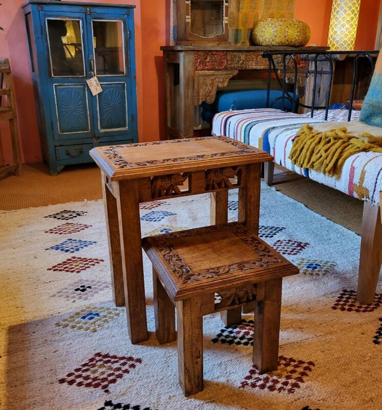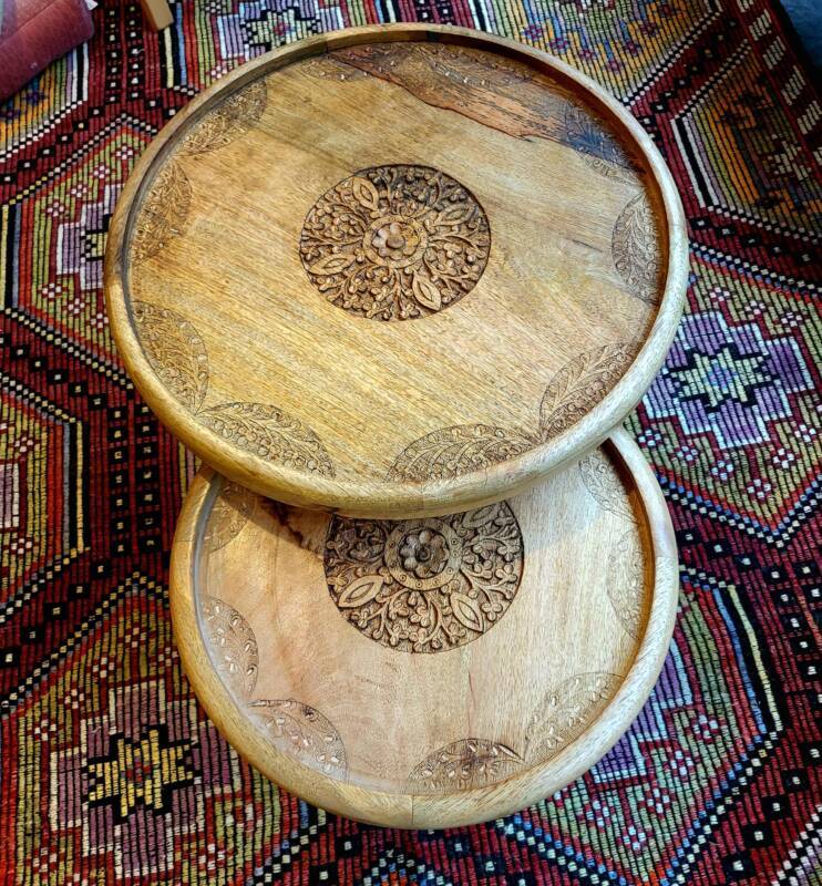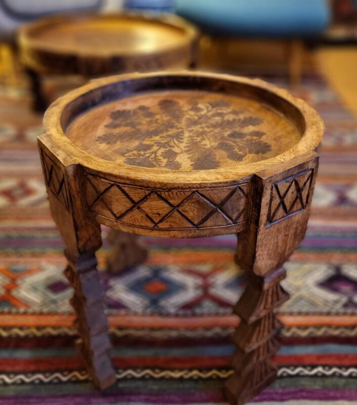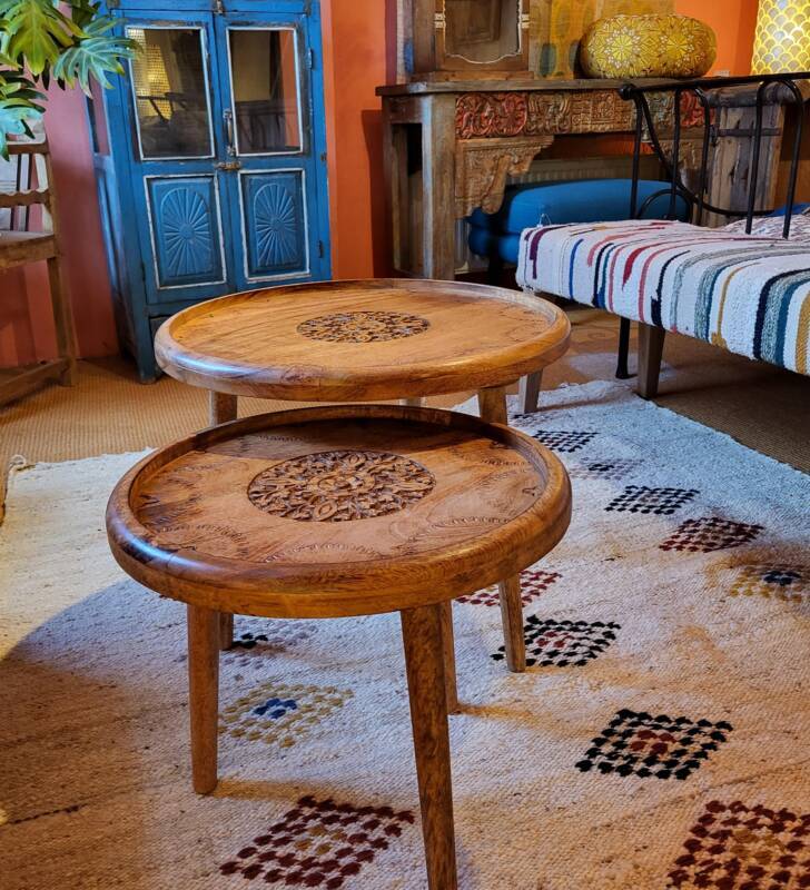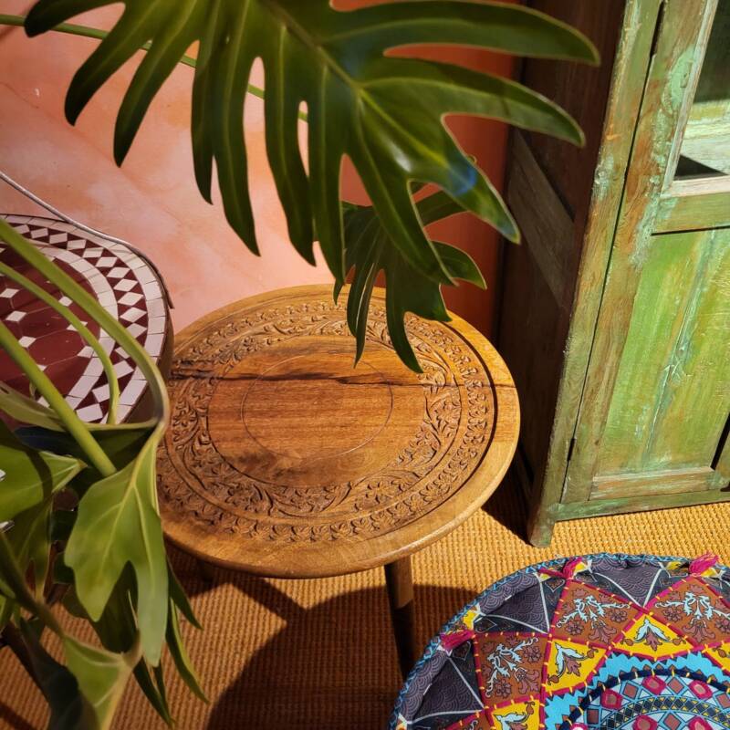 Deze bijzondere handgesneden/gegraveerde bijzettafels en salontafels, zijn tevens vervaardigd uit duurzaam mangohout. Dit hardhout wordt gebruikt wanneer de snel groeiende mangoboom geen vruchten meer draagt, zo krijgt het resthout een mooie andere bestemming en wordt er ruimte gemaakt voor nieuwe aanplant. Het heeft een rustiek uiterlijk, welke zich makkelijk laat combineren met ieder interieur. Bij de afwerking van het hout is gekozen voor een matte naturel of een antique finish, sommige uitvoeringen zijn in beiden kleurstellingen verkrijgbaar.