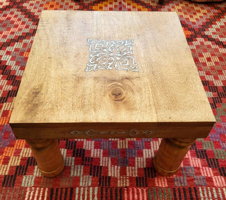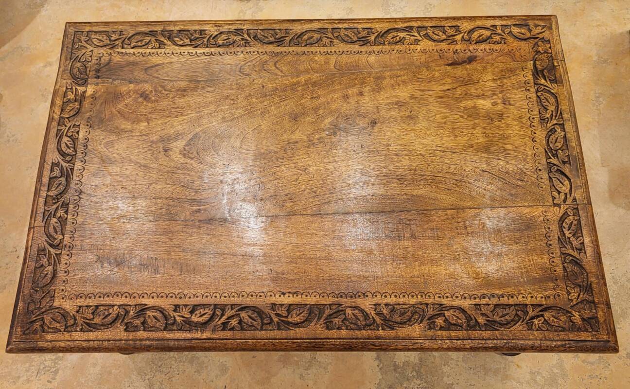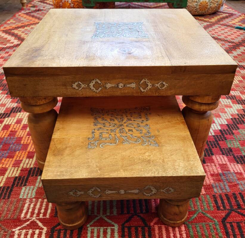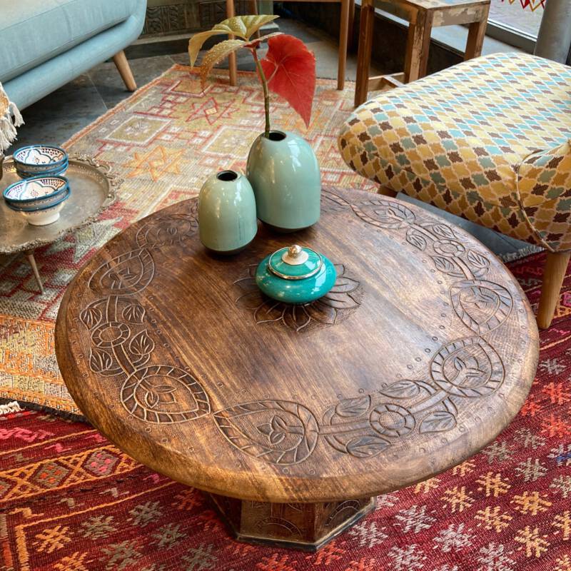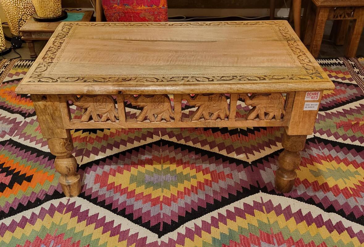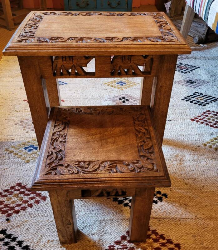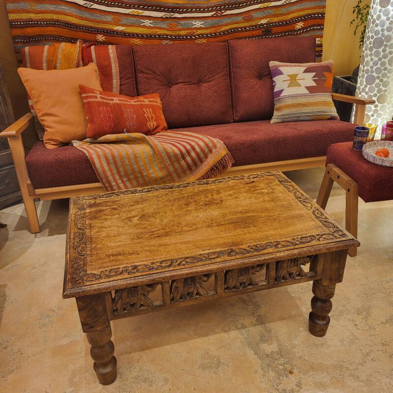 Deze bijzondere handgesneden/gegraveerde bijzettafels en salontafels, zijn tevens vervaardigd uit duurzaam mangohout. Dit hardhout wordt gebruikt wanneer de snel groeiende mangoboom geen vruchten meer draagt, zo krijgt het resthout een mooie andere bestemming en wordt er ruimte gemaakt voor nieuwe aanplant. Het heeft een rustiek uiterlijk, welke zich makkelijk laat combineren met ieder interieur. Bij de afwerking van het hout is gekozen voor een matte naturel of een antique finish, sommige uitvoeringen zijn in beiden kleurstellingen verkrijgbaar.