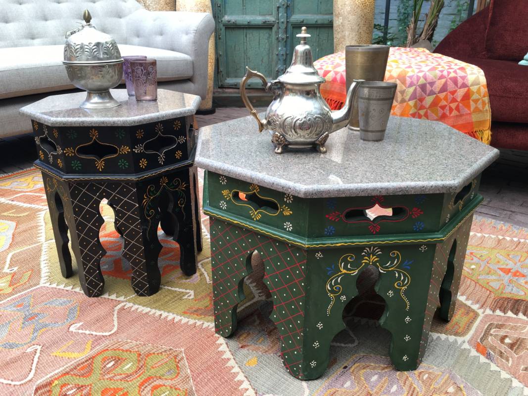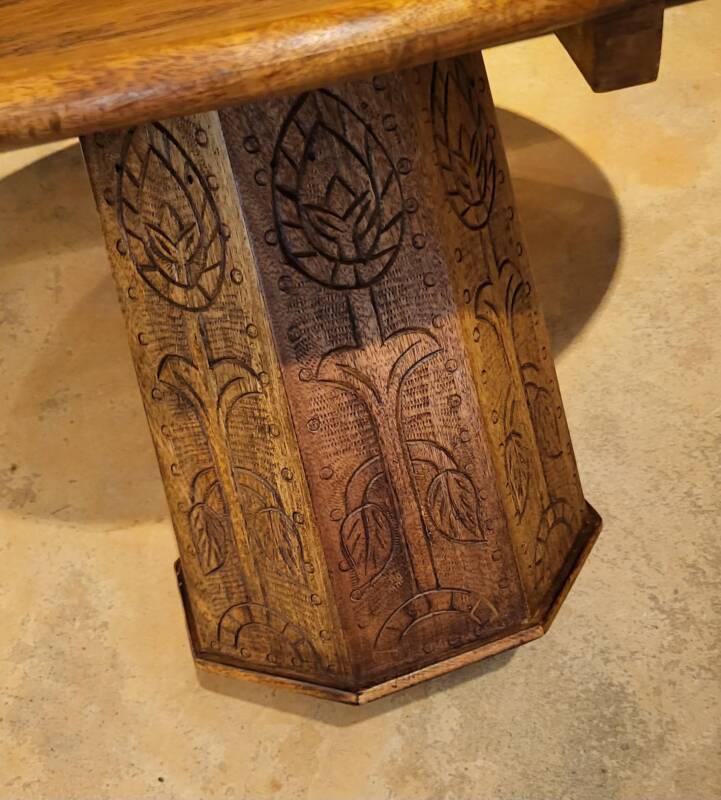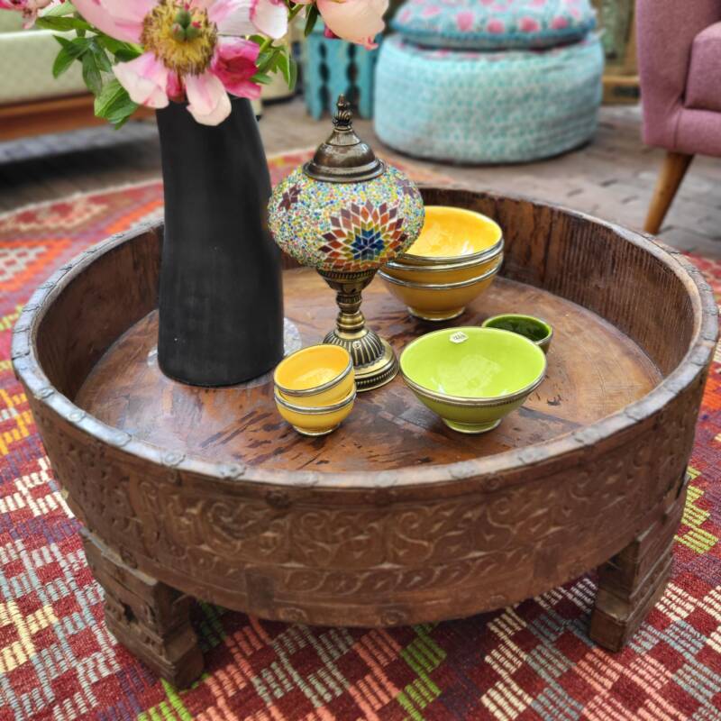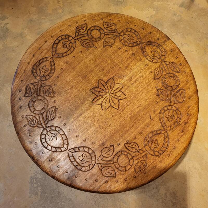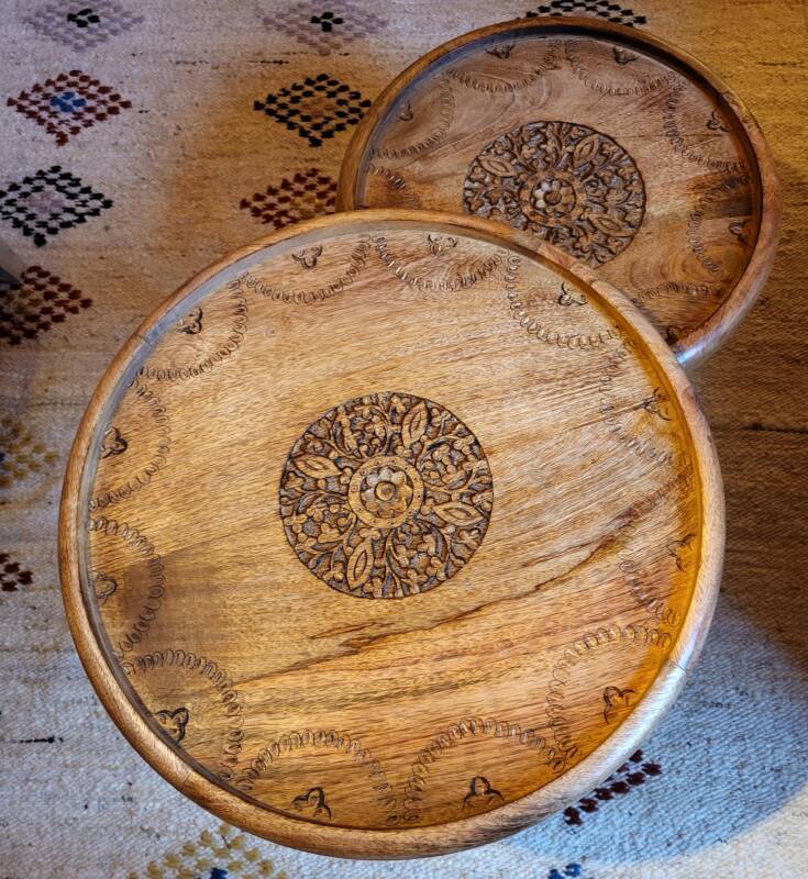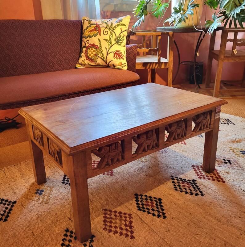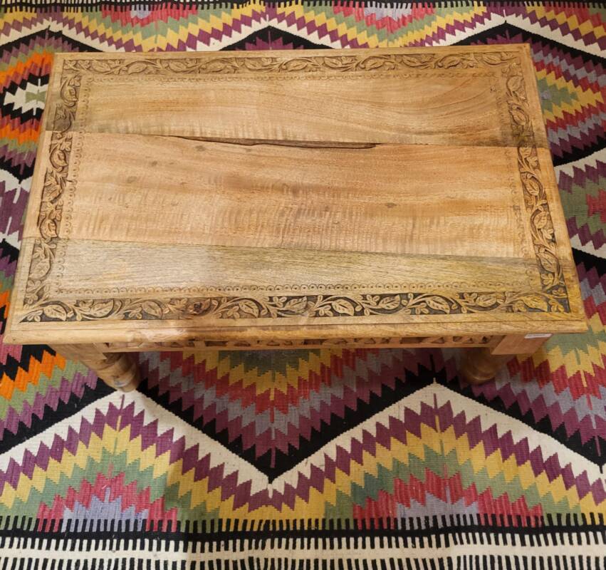 Deze bijzondere handgesneden/gegraveerde bijzettafels en salontafels, zijn tevens vervaardigd uit duurzaam mangohout. Dit hardhout wordt gebruikt wanneer de snel groeiende mangoboom geen vruchten meer draagt, zo krijgt het resthout een mooie andere bestemming en wordt er ruimte gemaakt voor nieuwe aanplant. Het heeft een rustiek uiterlijk, welke zich makkelijk laat combineren met ieder interieur. Bij de afwerking van het hout is gekozen voor een matte naturel of een antique finish, sommige uitvoeringen zijn in beiden kleurstellingen verkrijgbaar.