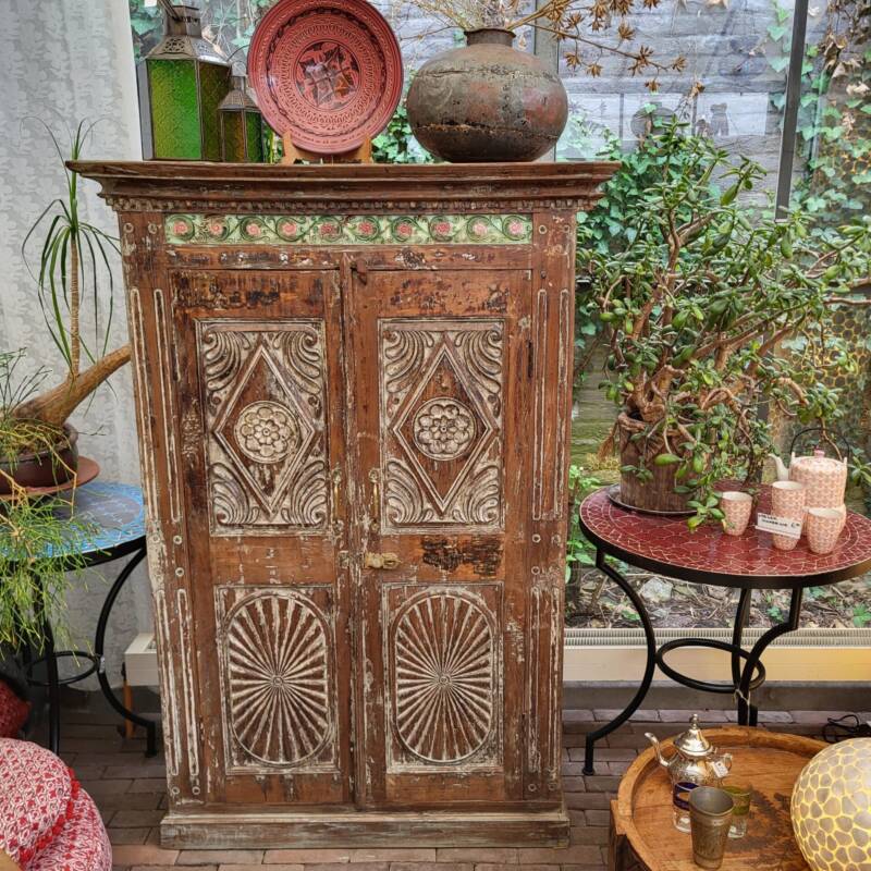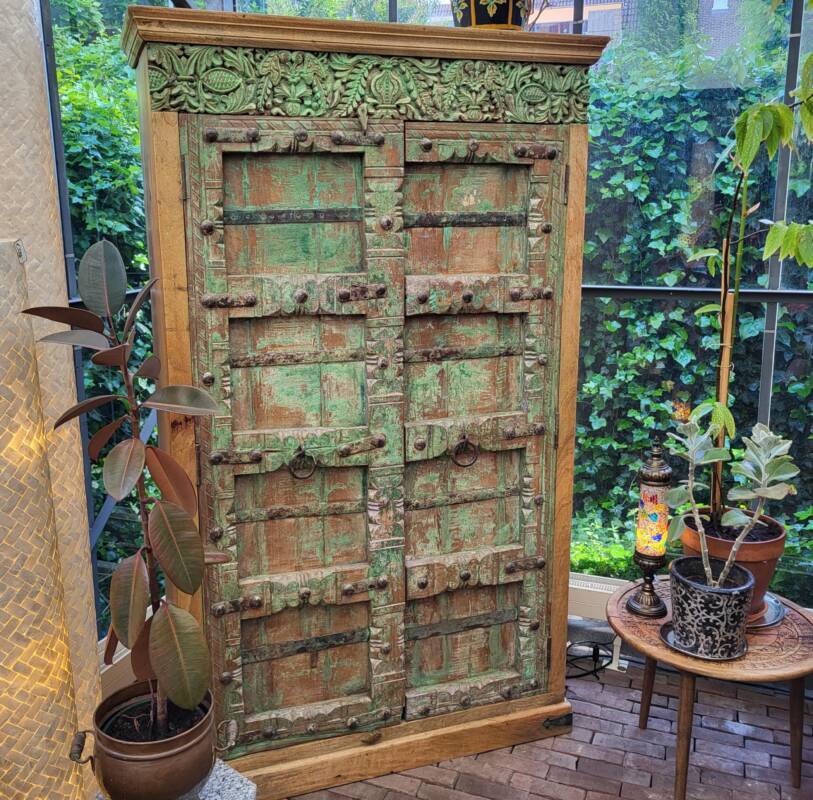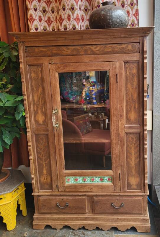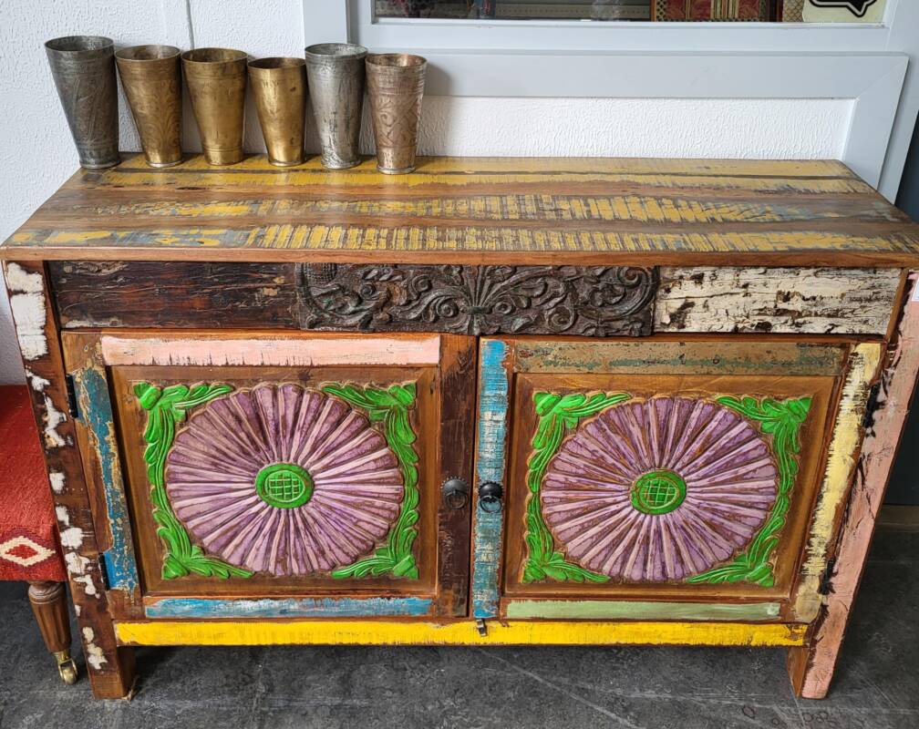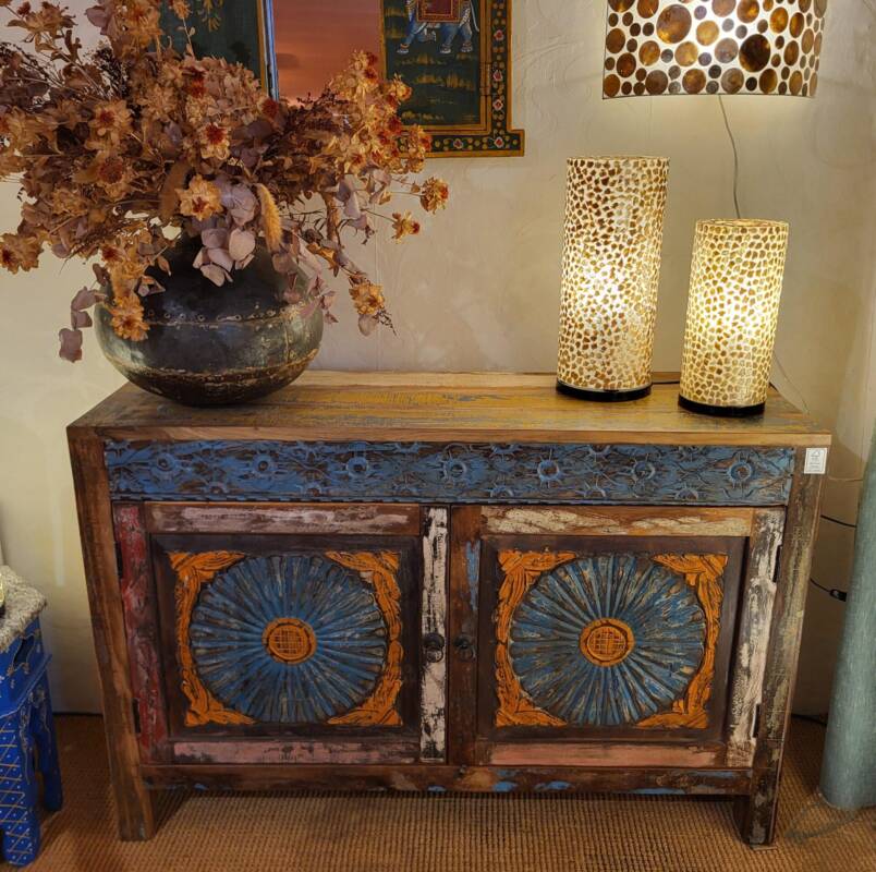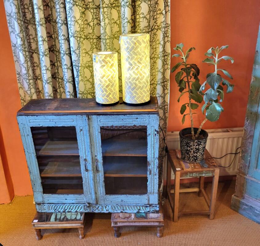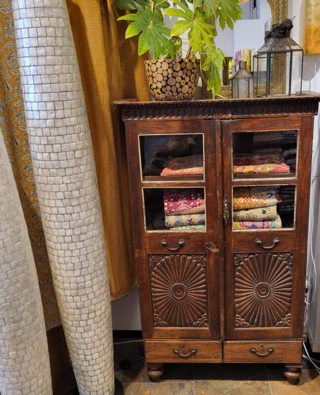 Een oude Indiase kast kan een mooi contrast geven in een modern interieur. Wij zoeken zorgvuldig naar de speciale, solide en unieke stukken. Geen gelikte kasten van teakhout, maar sfeervolle robuuste exemplaren met vaak verrassende details zoals gedecoreerd met tegels, wat nog een overblijfsel is van de Portugese invloed. Daarnaast verkopen we ook klein meubelen zoals, (geld) kisten, tafels gemaakt van omgetoverde babywiegjes en originele graanbakken. Met dit soort objecten haalt u echt iets bijzonders in huis.