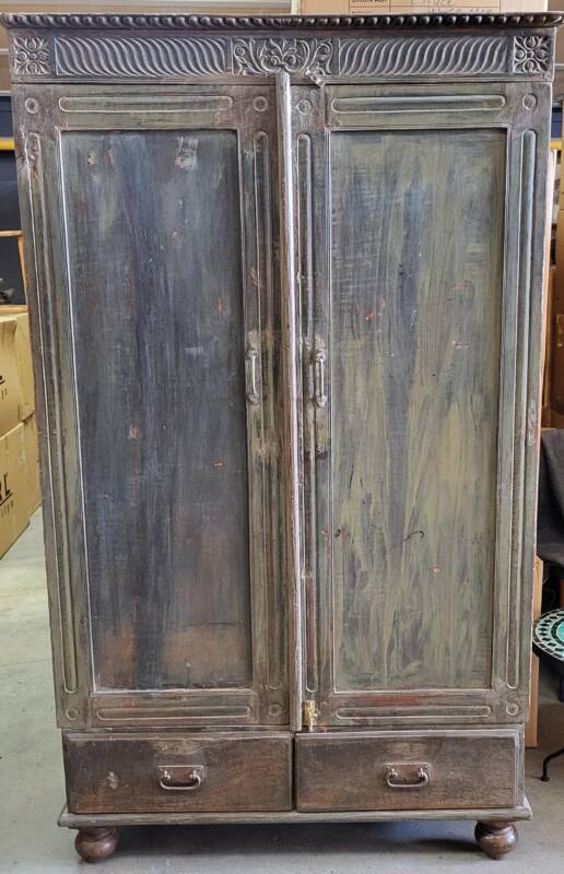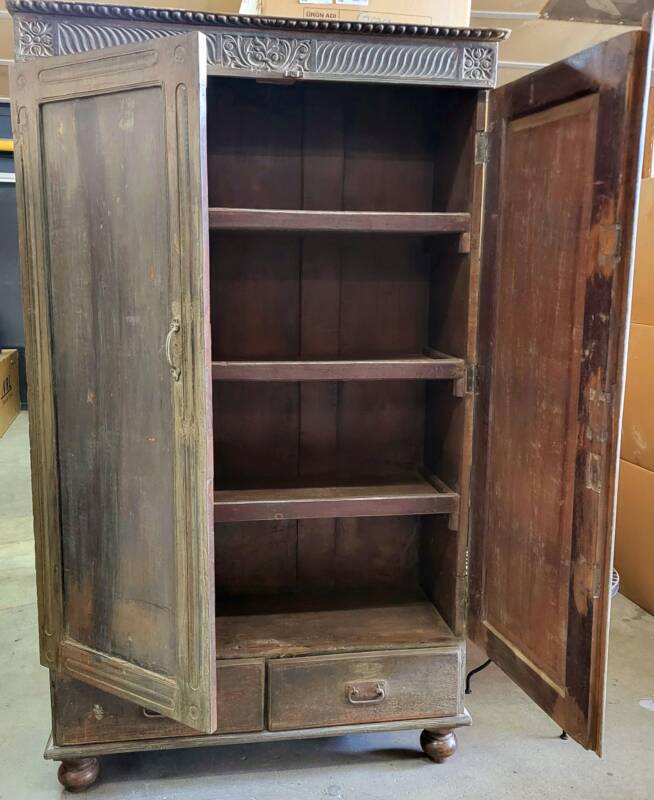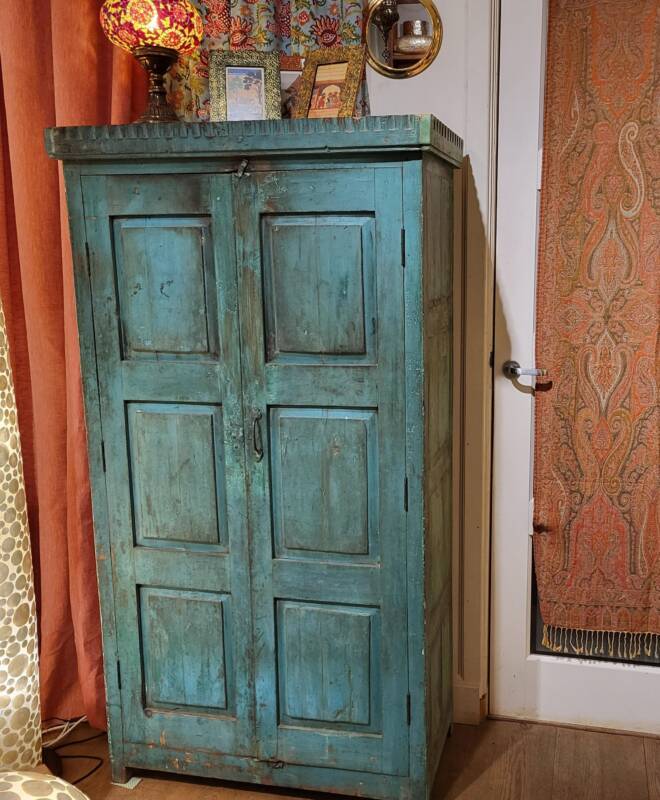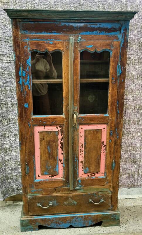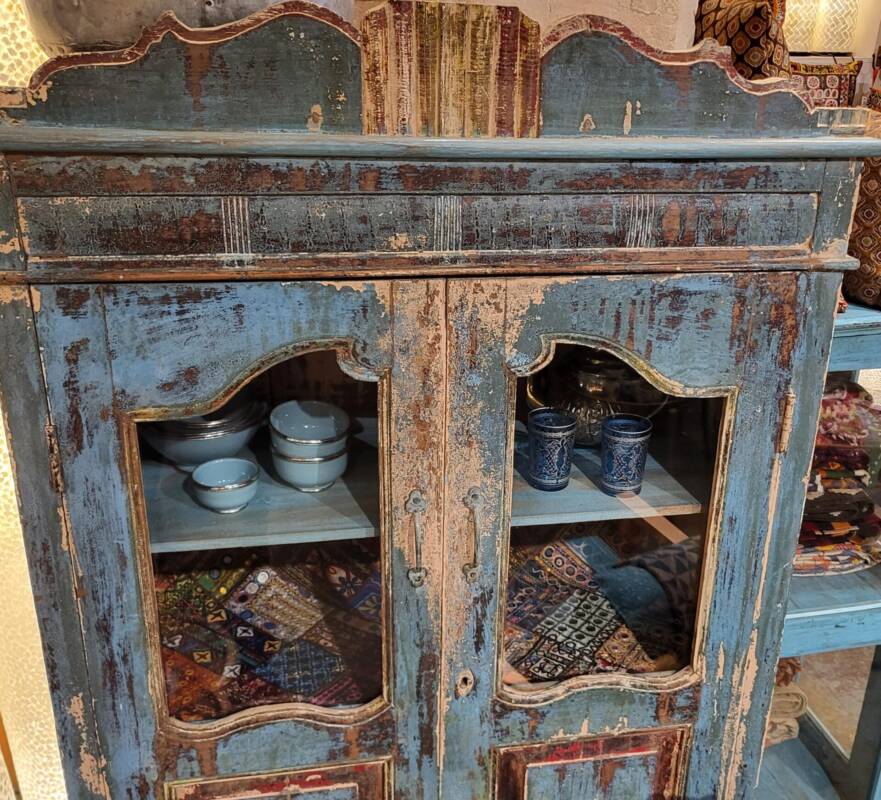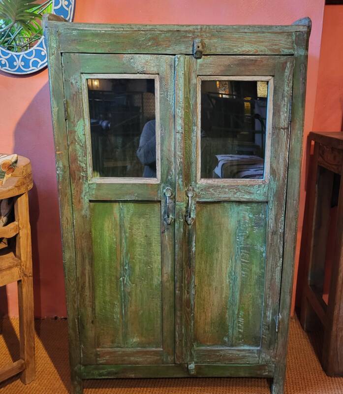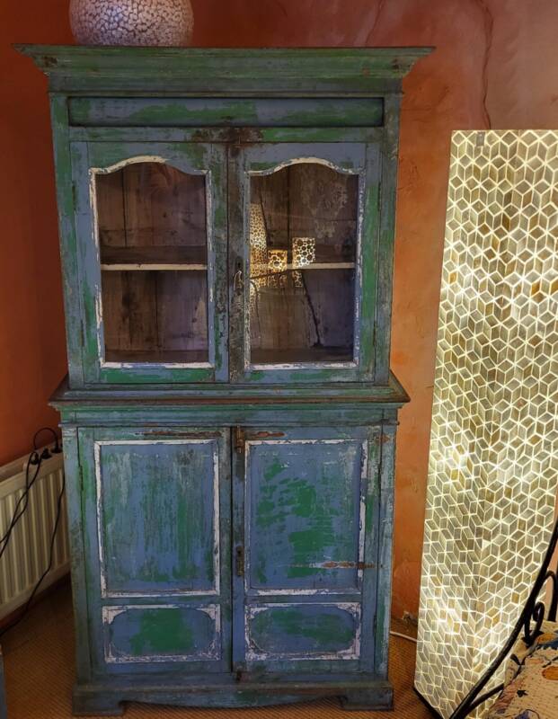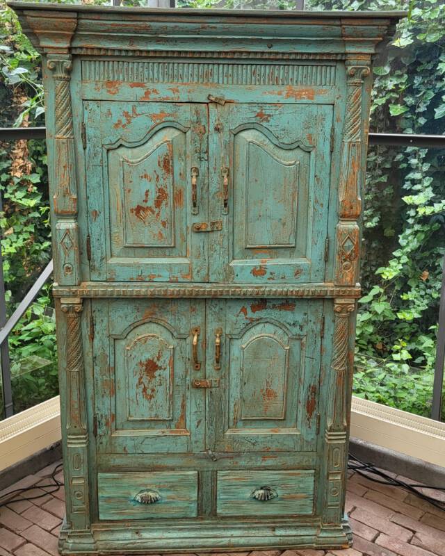 De achterkant van een kast verteld trouwens een geheel eigen verhaal. Wanneer deze uit een metalen plaat bestaat, werd hij veelal gebruikt in de keuken voor eten, dit geeft namelijk een soort van ventilatie systeem. Sommige kasten hebben aan de achterkant hele massieve houten panelen (soms met de schors er nog aan), deze werden door de dorpelingen zelf gefabriceerd, simpelweg door het bos in te lopen en een boom te kappen. Dat was dan wel in een andere tijd, zo’n 50 tot 80 jaar geleden. ’s Avonds na een lange drukke dag werd er rondom het kampvuur, bijgepraat en ondertussen hout bewerkt terwijl de kinderen zich vermaakten met zelfgemaakte speelgoed. Indien de exemplaren die we kunnen vinden nog in goede staat zijn, kiezen we ervoor deze orgineel te laten, zo kan een kast met een houten achterkant dus echt loodzwaar zijn. Naast de collectie in onze winkels, hebben we ook nog een aantal stukken in de opslag staan.