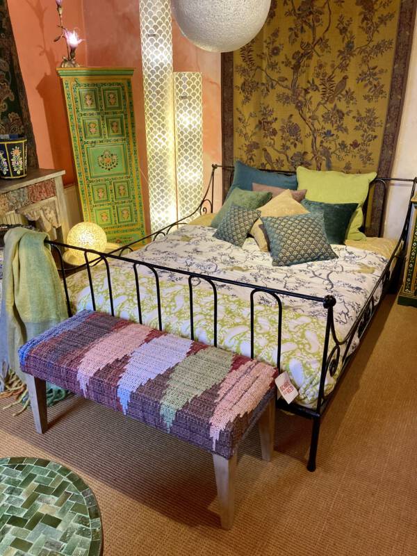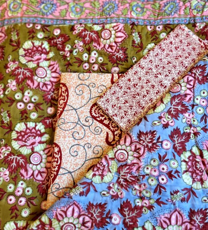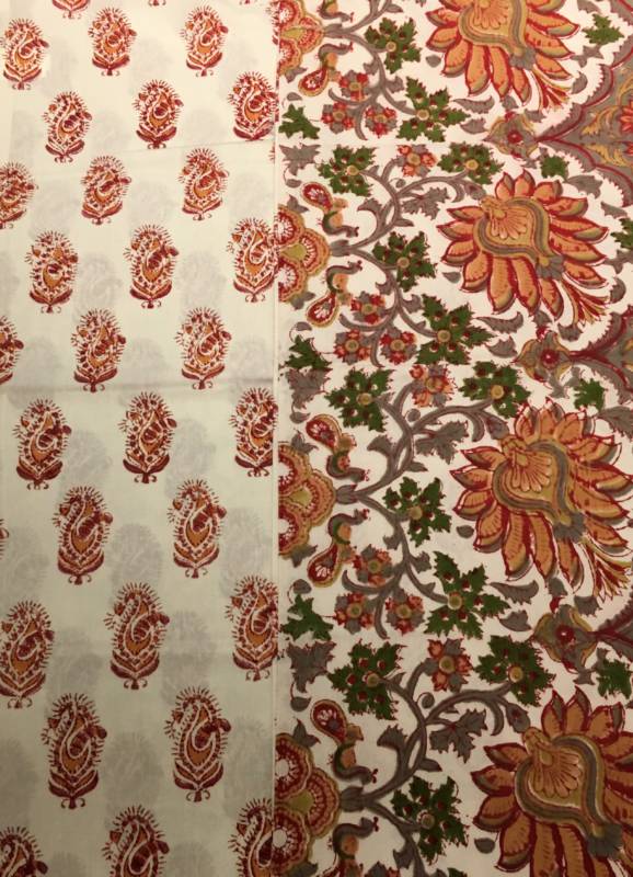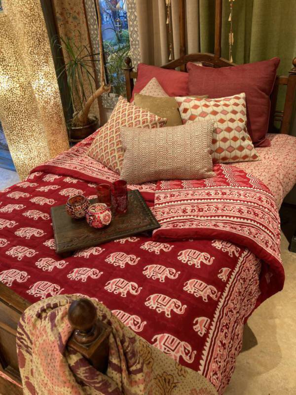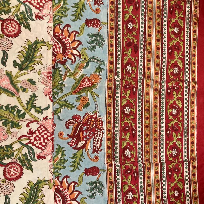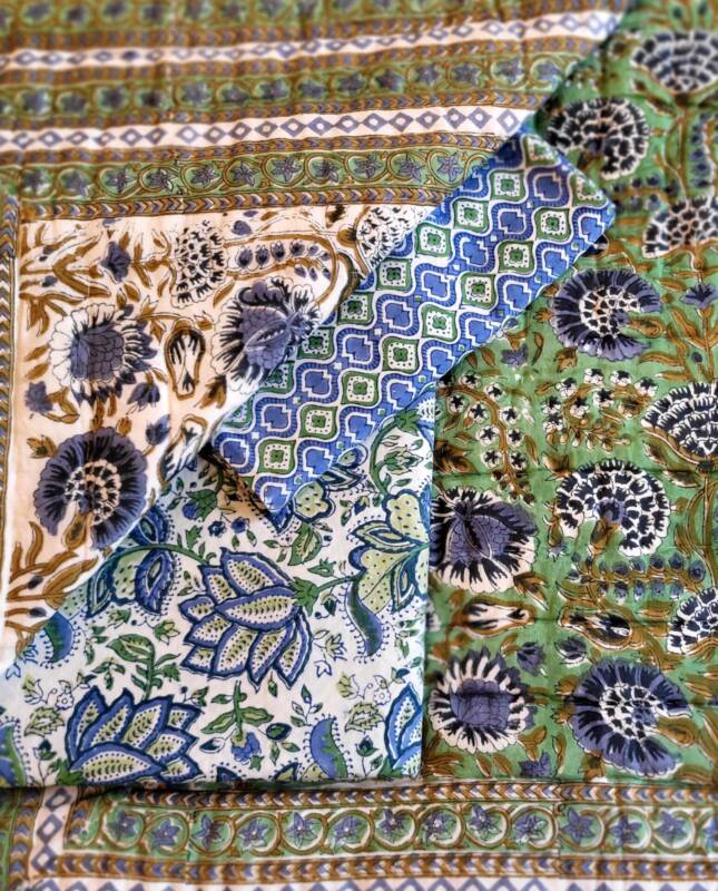 Onze prachtige handbedrukte collectie komt uit Jaipur in Rajasthan, de blockprint stad van India, waar nog steeds volgens een eeuwenoude traditie met teakhouten stempels stof wordt bedrukt. De stempels waarmee gewerkt wordt, zijn met de hand gesneden. Iedere kleurgang vereist een ander exemplaar, een patroon is dus opgebouwd uit meerdere stempels. Het printen vindt plaats op een speciale locatie in Jaipur, waar op een fatsoenlijke wijze, voor mens en natuur gewerkt wordt. Dit maakt dat u dubbel kunt genieten van deze producten. Ze zijn verkrijgbaar in de meest verrassende dessins. Op bovenstaande foto’s ziet u hoe het drukproces in zijn werk gaat en de blokken eruit zien. De schoonheid zit in de imperfectie!