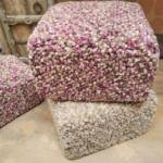 Deze handbedrukte poefs zijn van een zwaardere kwaliteit. Ze zijn in verschillende kleuren verkrijgbaar en aan twee kanten te gebruiken. Iedere poef is zorgvuldig bedrukt met behulp van houten stempels. Het bovenkussen kost € 39,- en de poef is € 79,- per stuk. Een complete set zoals op bovenstaande foto’s te zien is, kost € 118,-. Zowel buiten- als binnenkant is gemaakt van 100% katoen. Een complete poef met kussen is 46 cm hoog en zonder kussen 42 cm, de doorsnede is plusminus 57 cm.