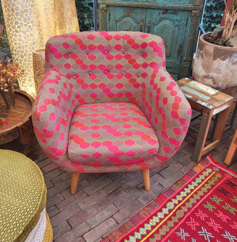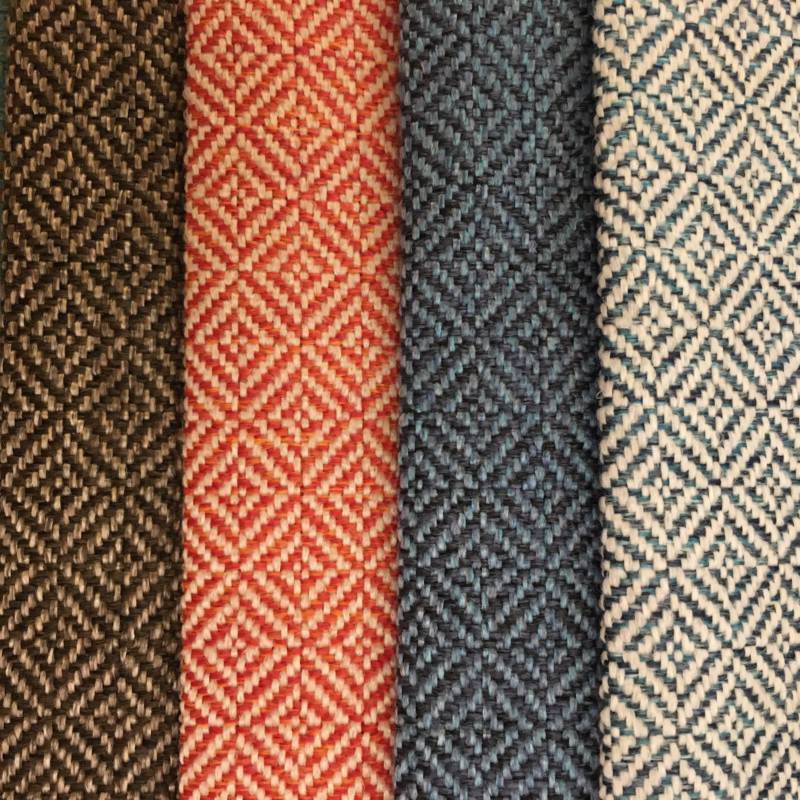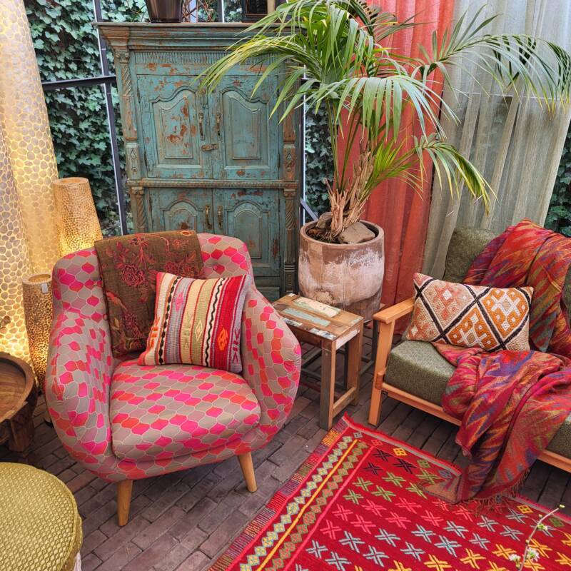 Deze meubelen zijn ambachtelijk vervaardigd. De gebruikte houtsoort is mango gecombineerd met handgeweven gerecyclede katoen. Door het gebruik van oude textielresten ontstaat er een grillige gedessineerde bekleding, dat maakt ieder exemplaar uniek.