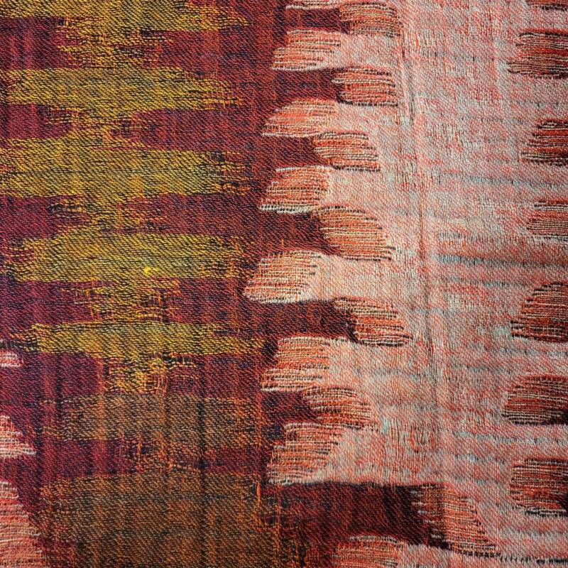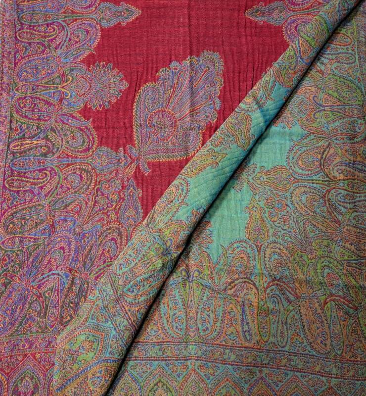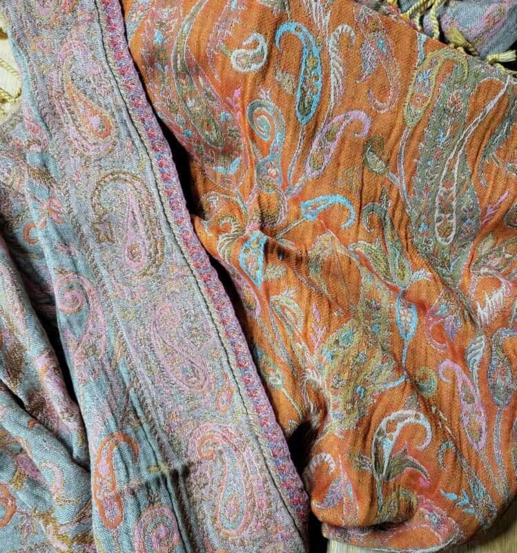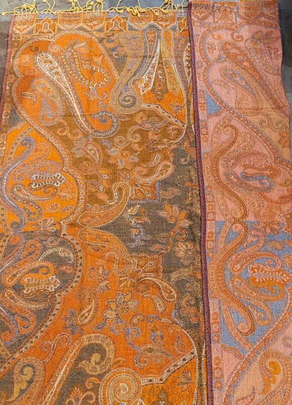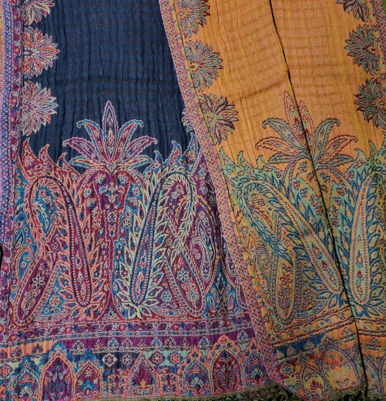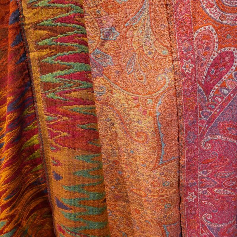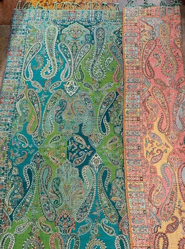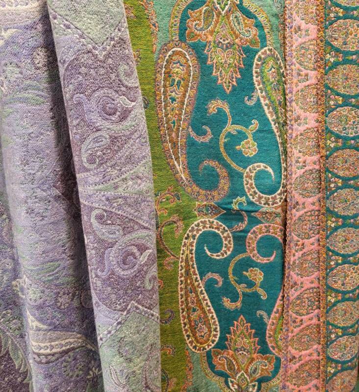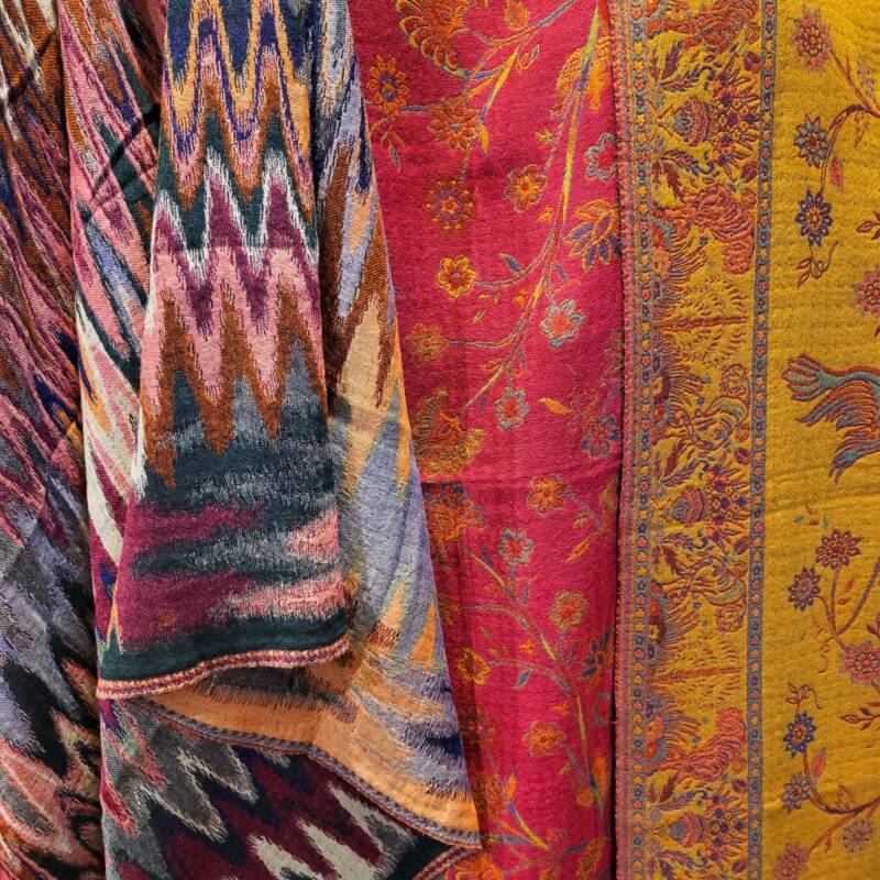 Klassiek zijn de jaquard geweven met borduurwerk erop in wol of zijde. Er is een serie met verschillende kleurvlakken, deze zijn gemaakt van hele fijne zachte wol. Bij ons vindt u echter ook mooie kleurrijke handgeweven wol/zijde combinaties met geometrische patronen. Dessins als design, die het tevens prachtig als tafelloper of wanddecoratie doen. De prijzen liggen tussen 59,- en 79,- euro.
