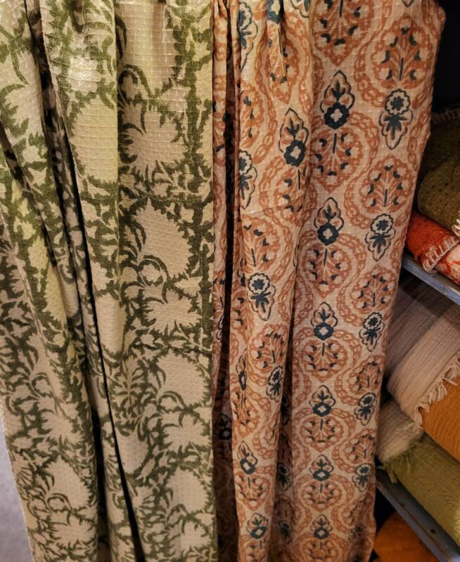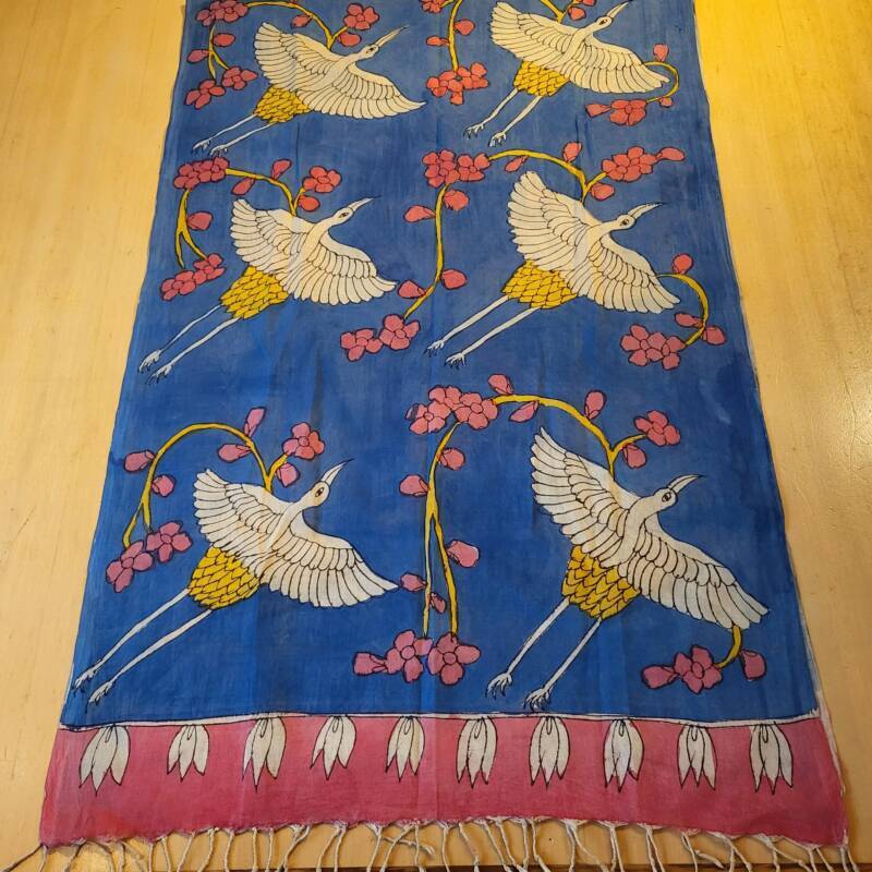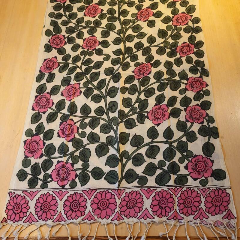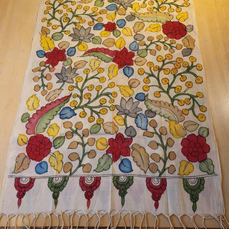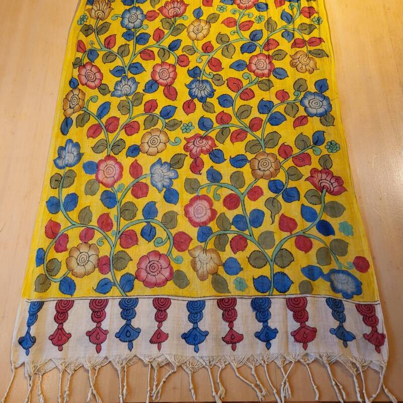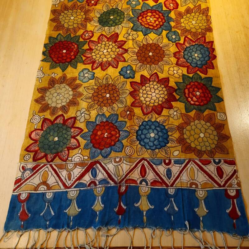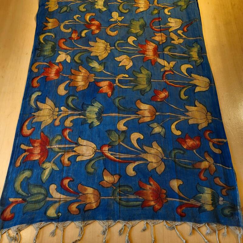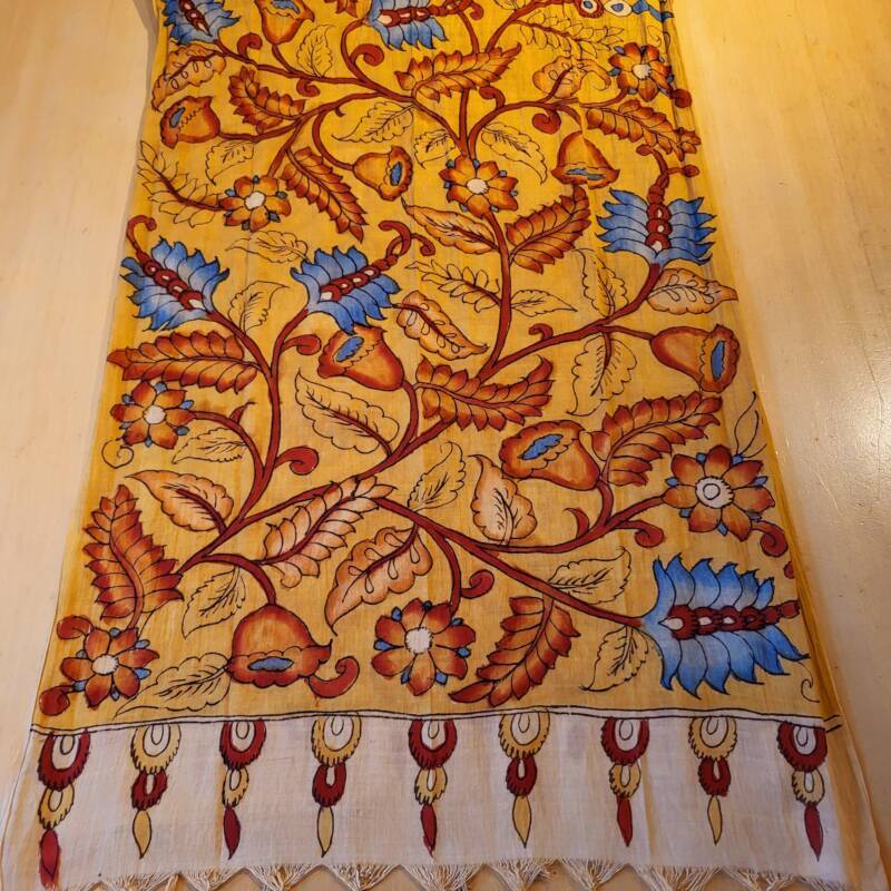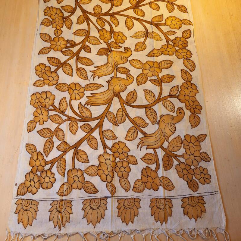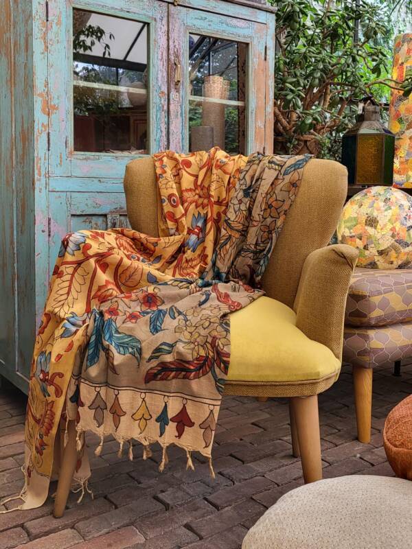 Bovenstaande sjaals zijn handbeschilderd met natuurlijke verfstoffen. Kalamkari, het woord is onstaan uit het Perzisch van kalam (pen) en kari (craftsmanship) en vind zijn oorsprong in het Golconda Sultanaat. Een zeer oude teken techniek met een tamarind pen vormt de basis voor deze bijzondere doeken, welke gemaakt zijn van 100% katoen. Buffelmelk en kleuren gemaakt van planten (waaronder wortels, zaden en fijn gemalen bloemblaadjes) en mineralen zijn de ingredienten voor het schilderwerk, de kerspruim wordt gebruikt voor fixatie. De lokale kunstenaars uit Zuid-India halen hun inspiratie hiervoor uit de natuur en de lokale folklore. Kalamkari staat bekend als een “helende stof “, de motieven en magische vormen weerspiegelen spiritualiteit en vormen een helend aura. Weer iets heel bijzonders voor de liefhebber! Ze kosten € 42,50 per stuk.