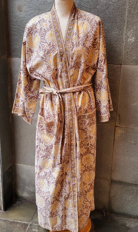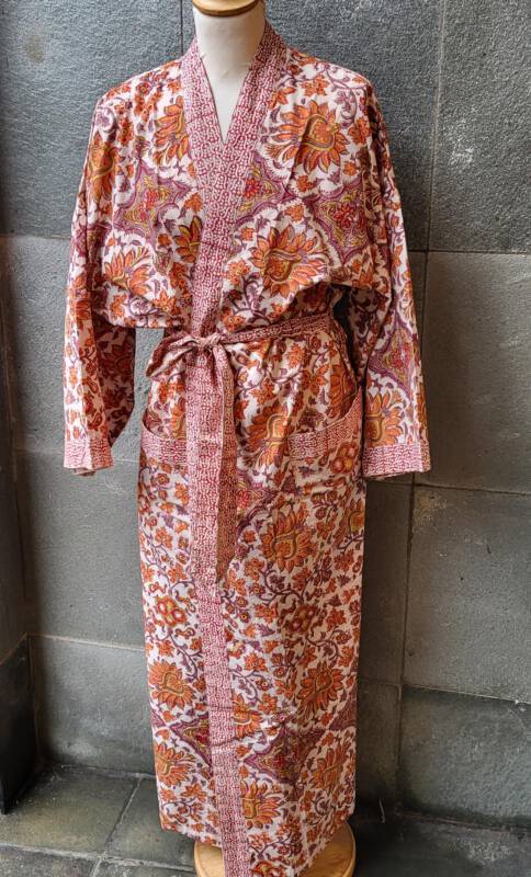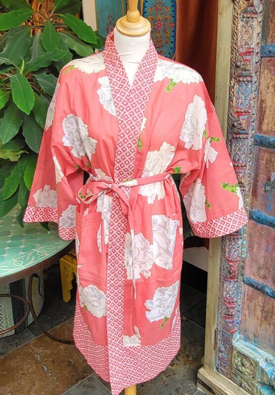 Deze kimono’s zijn gemaakt van bedrukte katoenen voile. Ze zijn in één maat verkrijgbaar en zitten heerlijk! Dit model valt zeer soepel en is heerlijk voor zwoele zomeravonden. Doordat ze niet veel plaats innemen in de koffer, zijn ze volgens veel klanten, ook zeer aangenaam reisgezelschap.