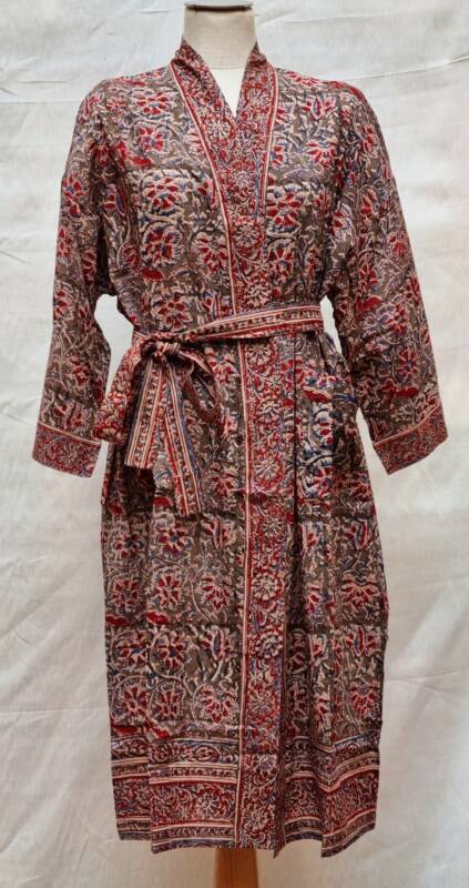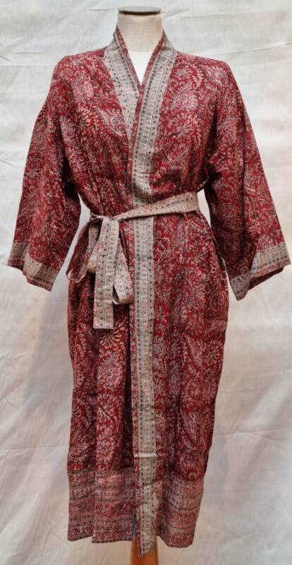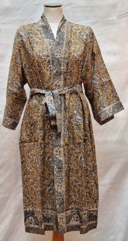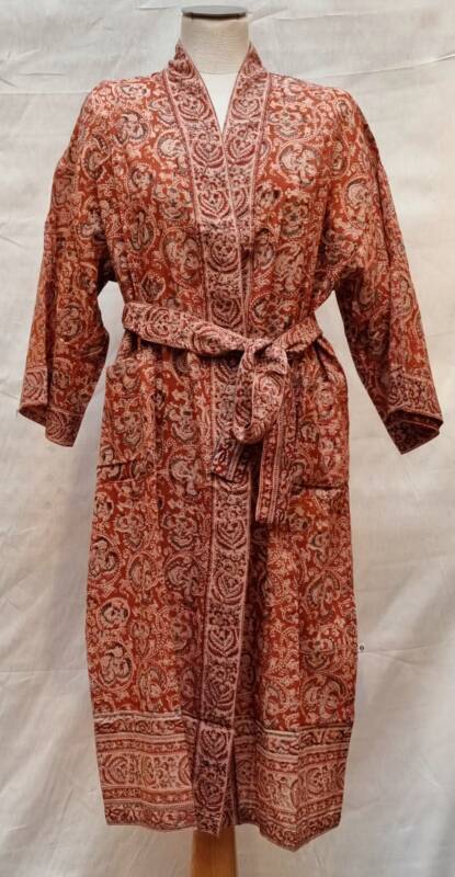Kalamkari, het woord is onstaan uit het Perzisch van kalam (pen) en kari (craftsmanship). Een zeer oude teken techniek met een tamarind pen vormt de basis van deze handbedrukte stoffen, welke gemaakt zijn van 100% katoen. De gebruikte kleuren zijn volledig plantaardig en bestaan oa. uit wortels, zaden, fijn gemalen bloemblaadjes en mineralen. Een bijzonder ambacht wat wij graag weer onder de aandacht brengen. De kimono’s van deze unieke collectie kosten € 55,- per stuk.