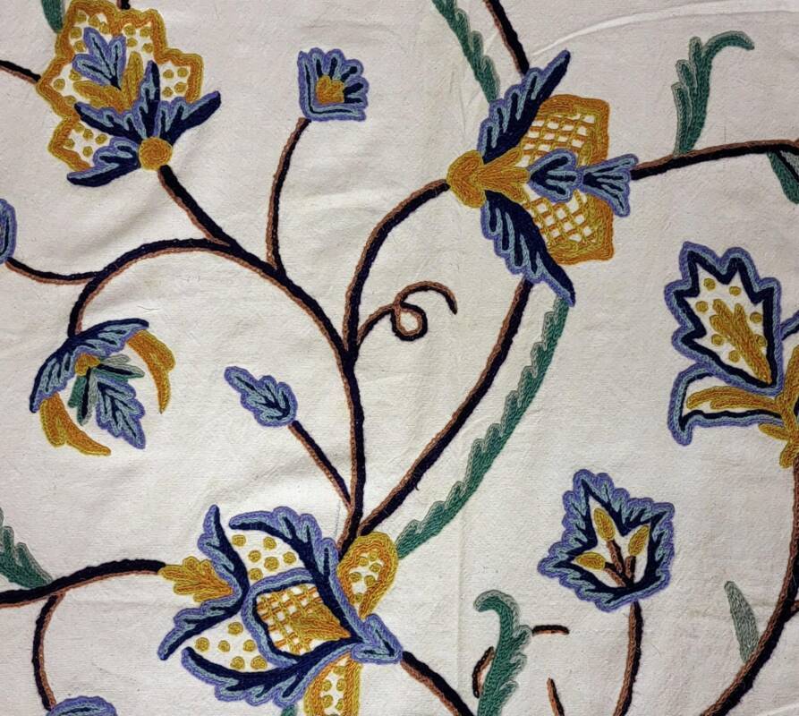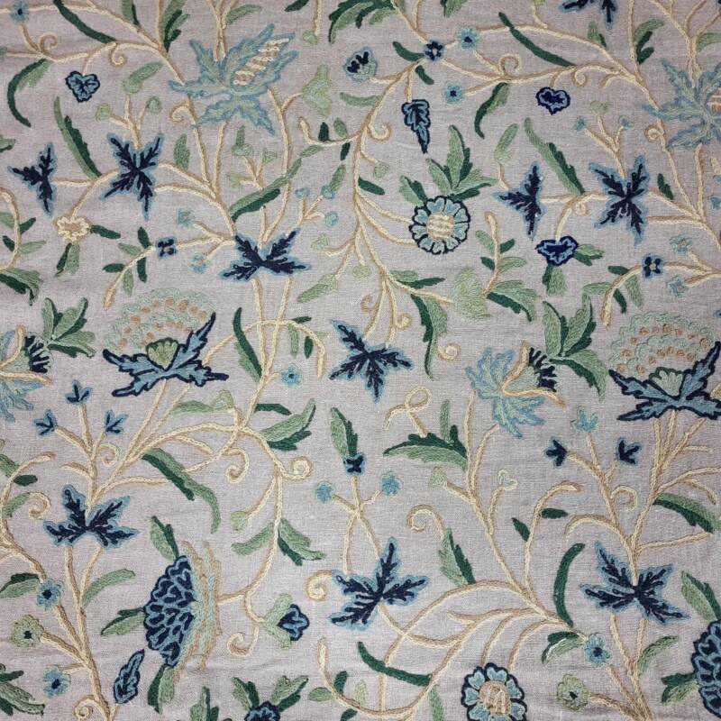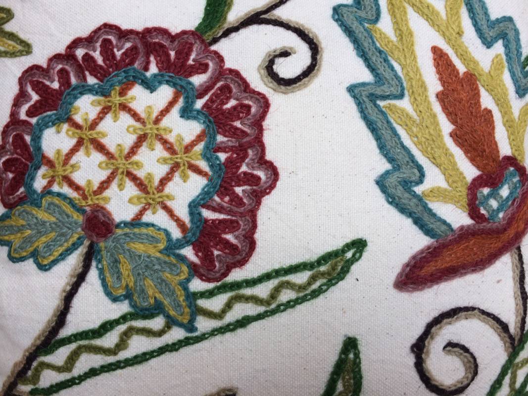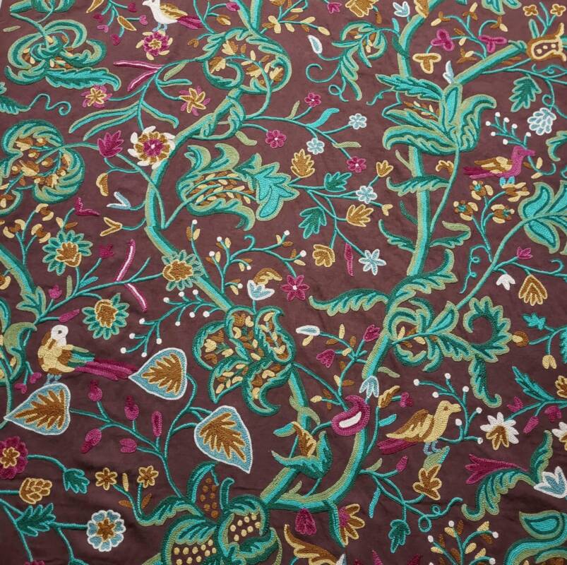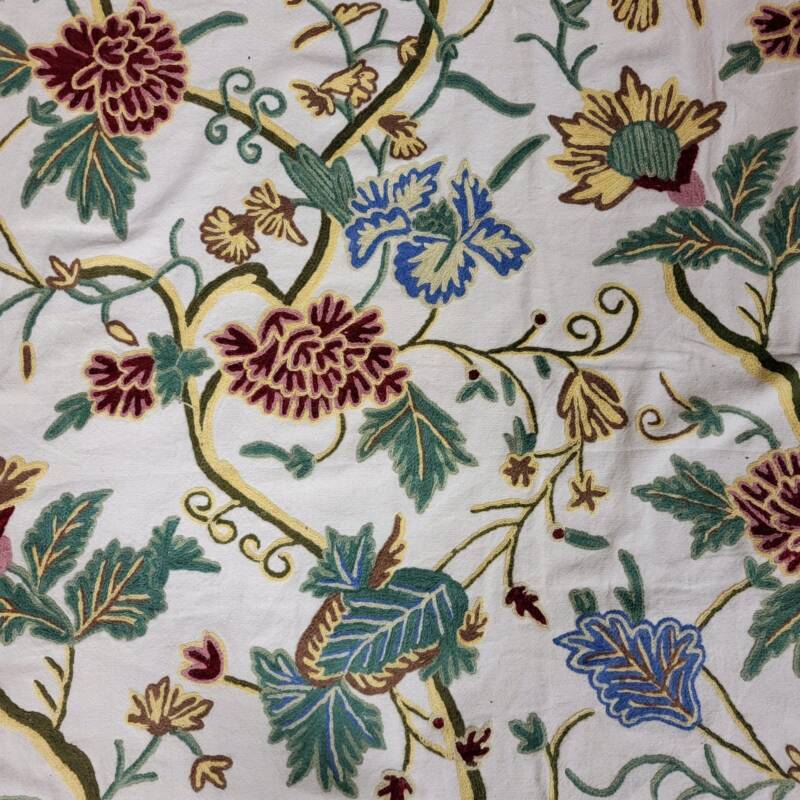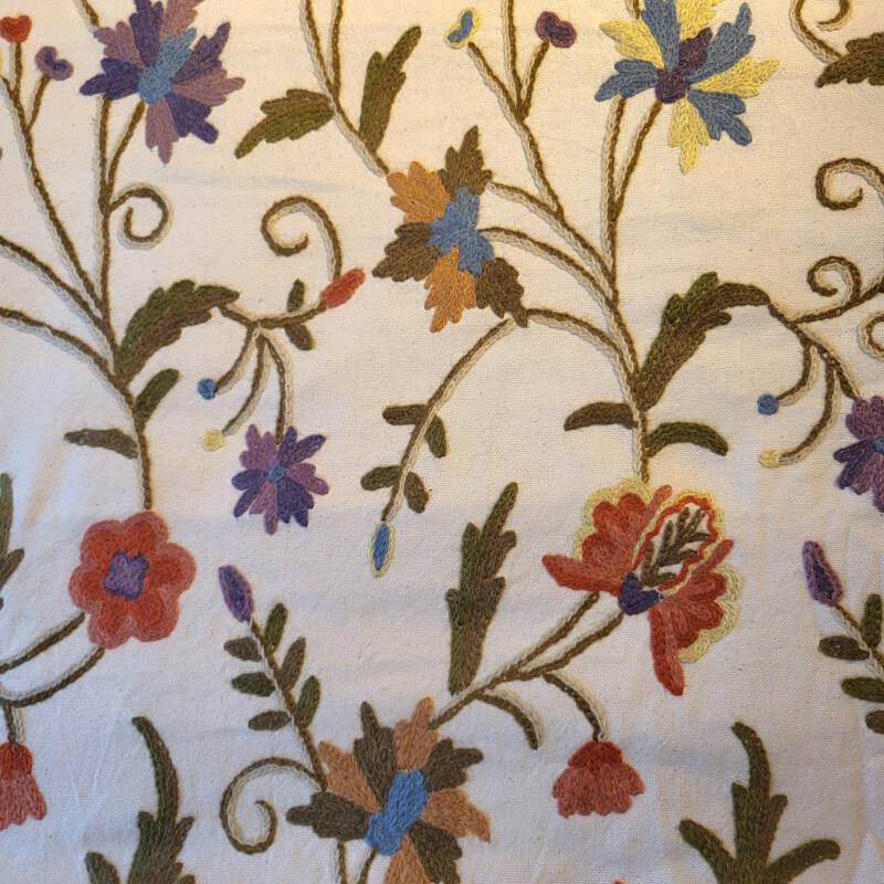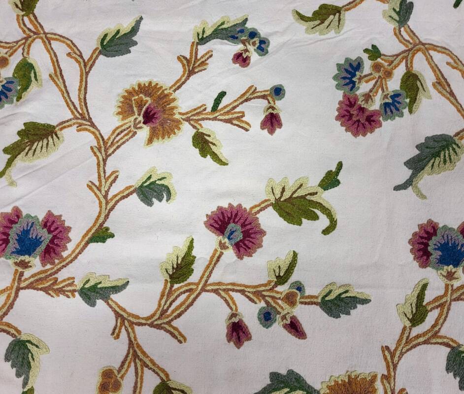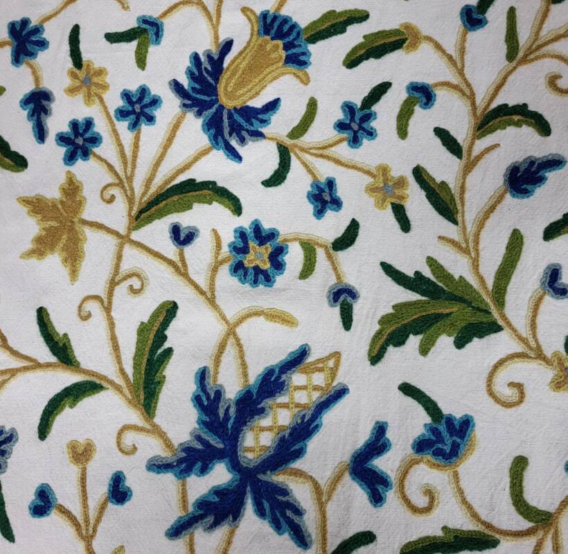 Crewelwork is een handmatige borduur techniek waarbij met een wollen draad en een soort haaknaald ( Aari naald ) via een kettingsteek patronen op katoen, linnen of katoenen organza wordt vervaardigd. Het is een traditionele techniek, in het ontwerp zijn meestal florale en/of dier figuren te vinden. Kronkelende takken en bladeren verbinden de kleurrijke bloemen met elkaar. Dit ambacht wordt nog slechts door een kleine groep mensen beoefend. De bedrijven waar wij mee werken hebben oog voor de werkomstandigheden en respect voor het milieu.