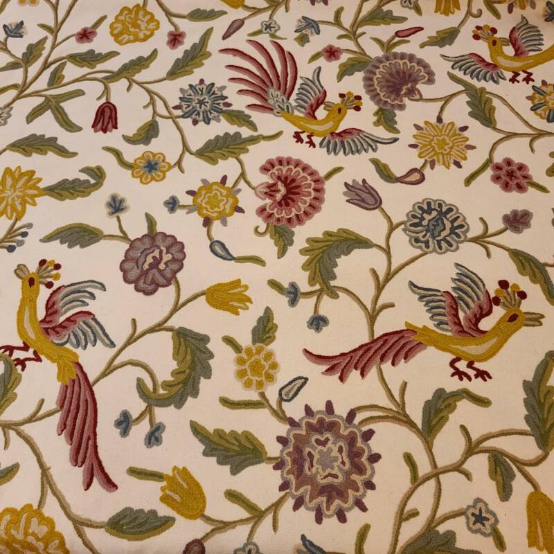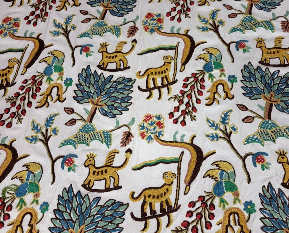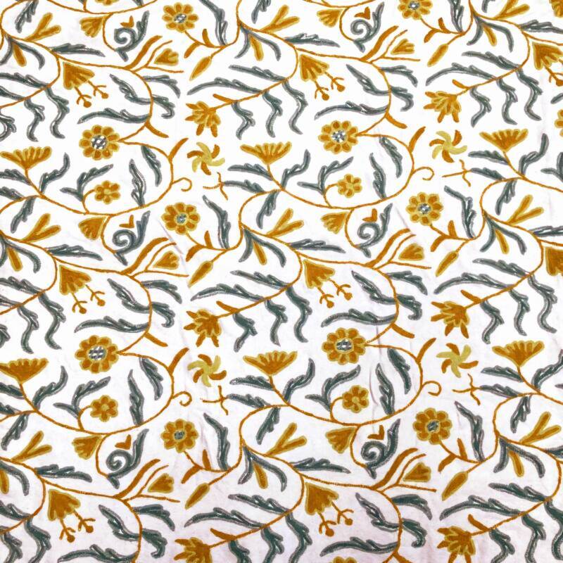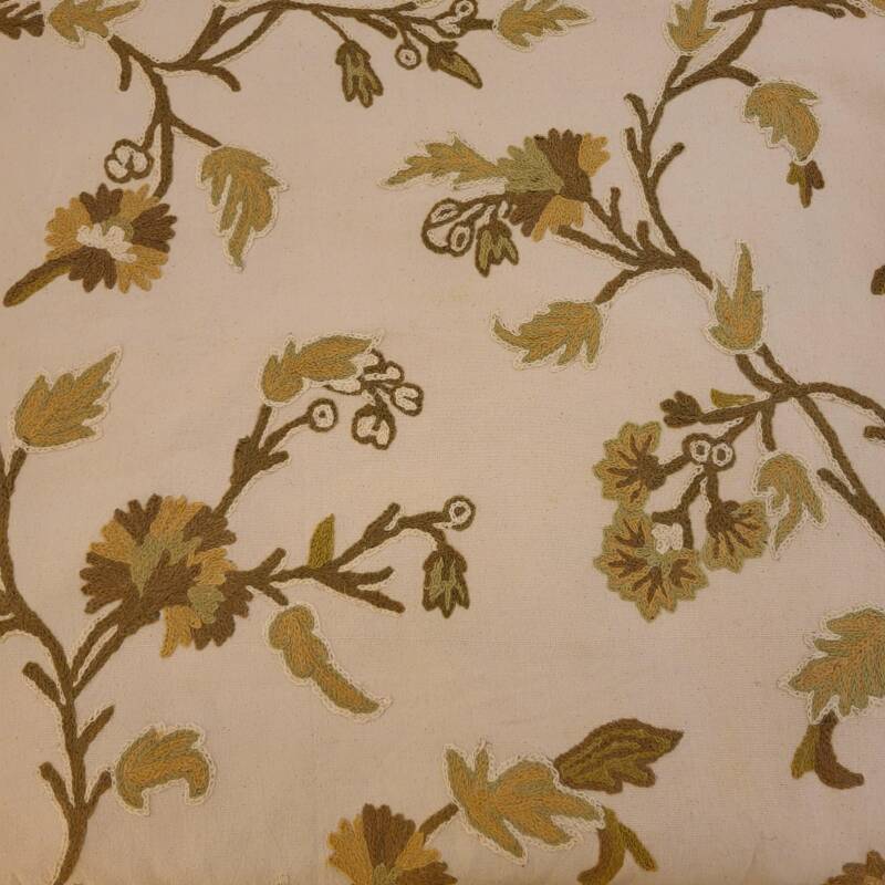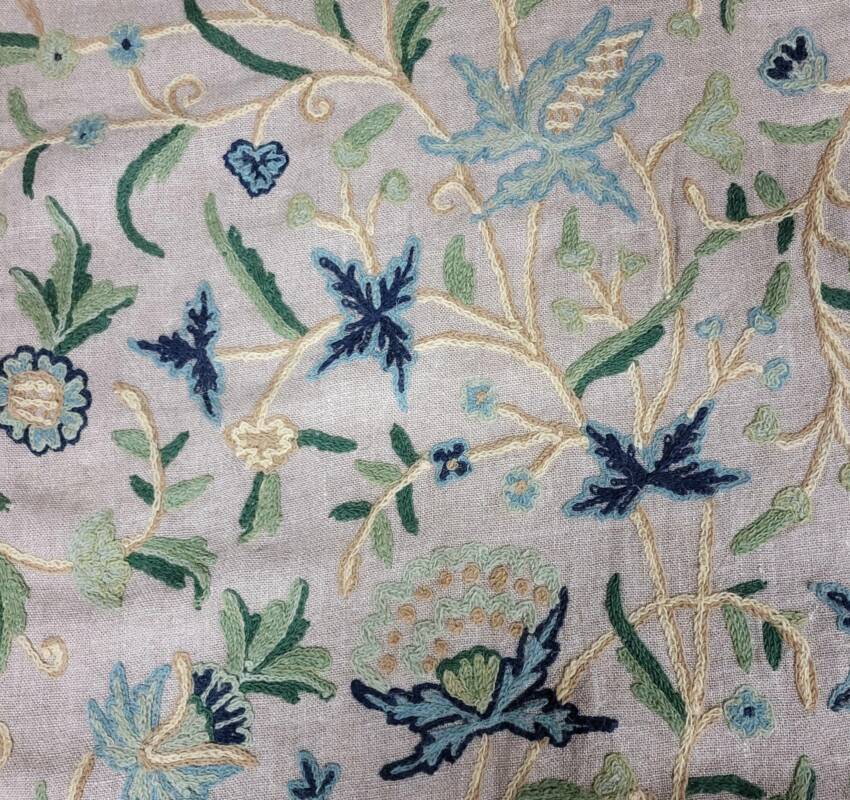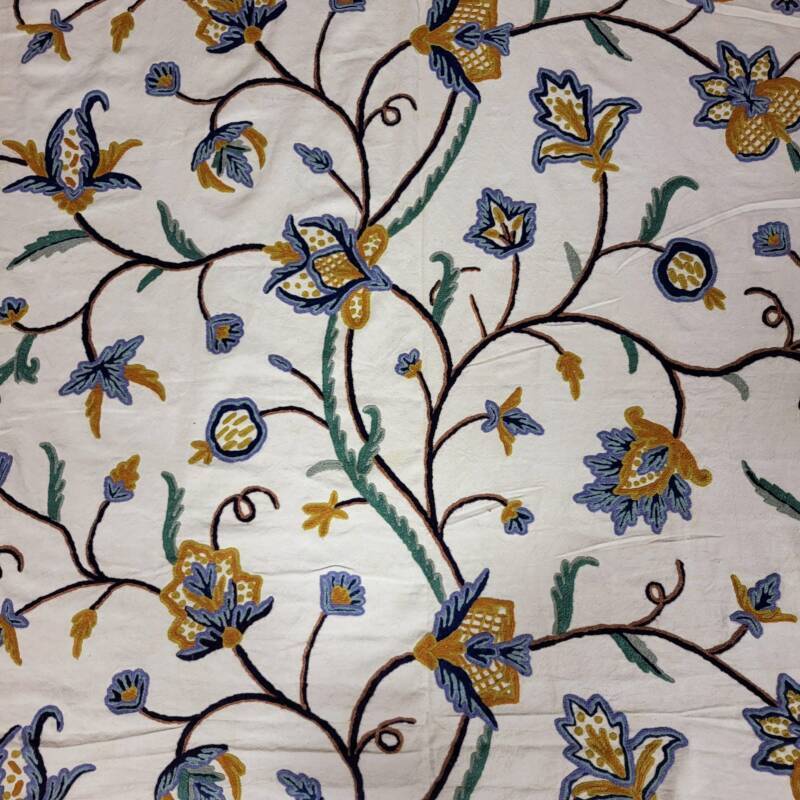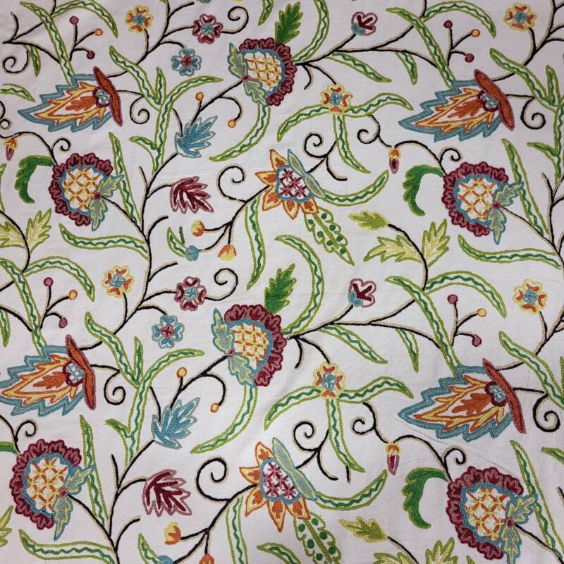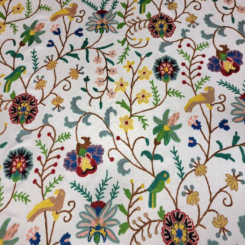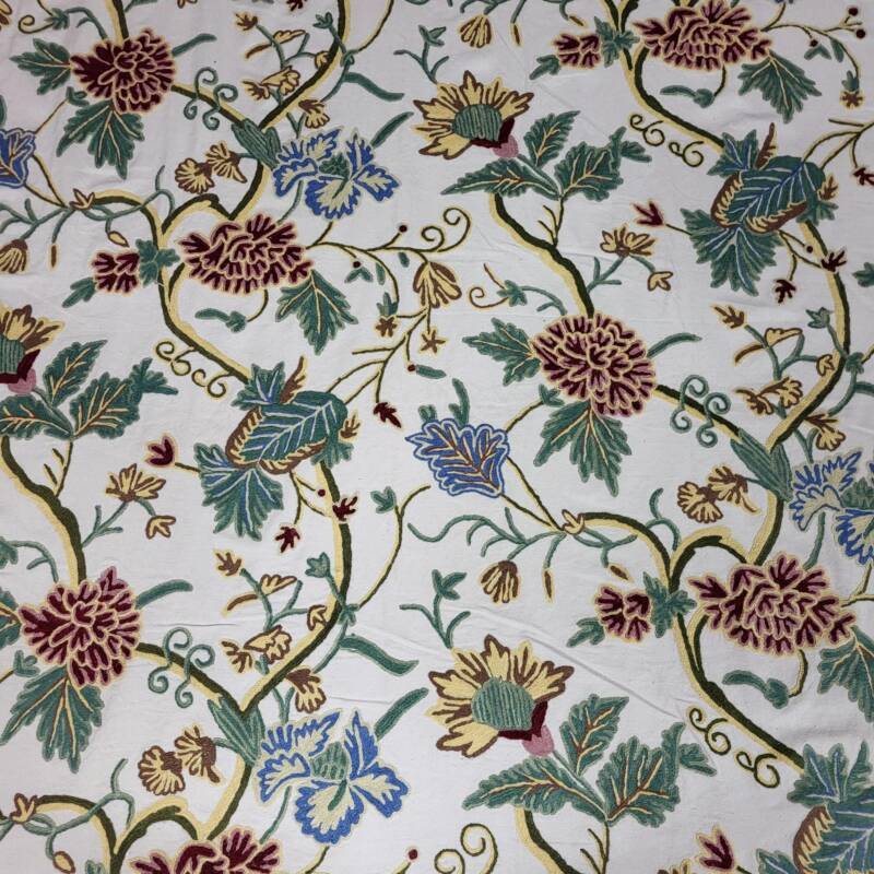 Crewelwork is een handmatige borduur techniek waarbij met een wollen draad en een soort haaknaald ( Aari naald ) via een kettingsteek patronen op katoen, linnen of katoenen organza wordt vervaardigd. Het is een traditionele techniek, in het ontwerp zijn meestal florale en/of dier figuren te vinden. Kronkelende takken en bladeren verbinden de kleurrijke bloemen met elkaar. Dit ambacht wordt nog slechts door een kleine groep mensen beoefend. De bedrijven waar wij mee werken hebben oog voor de werkomstandigheden en respect voor het milieu.