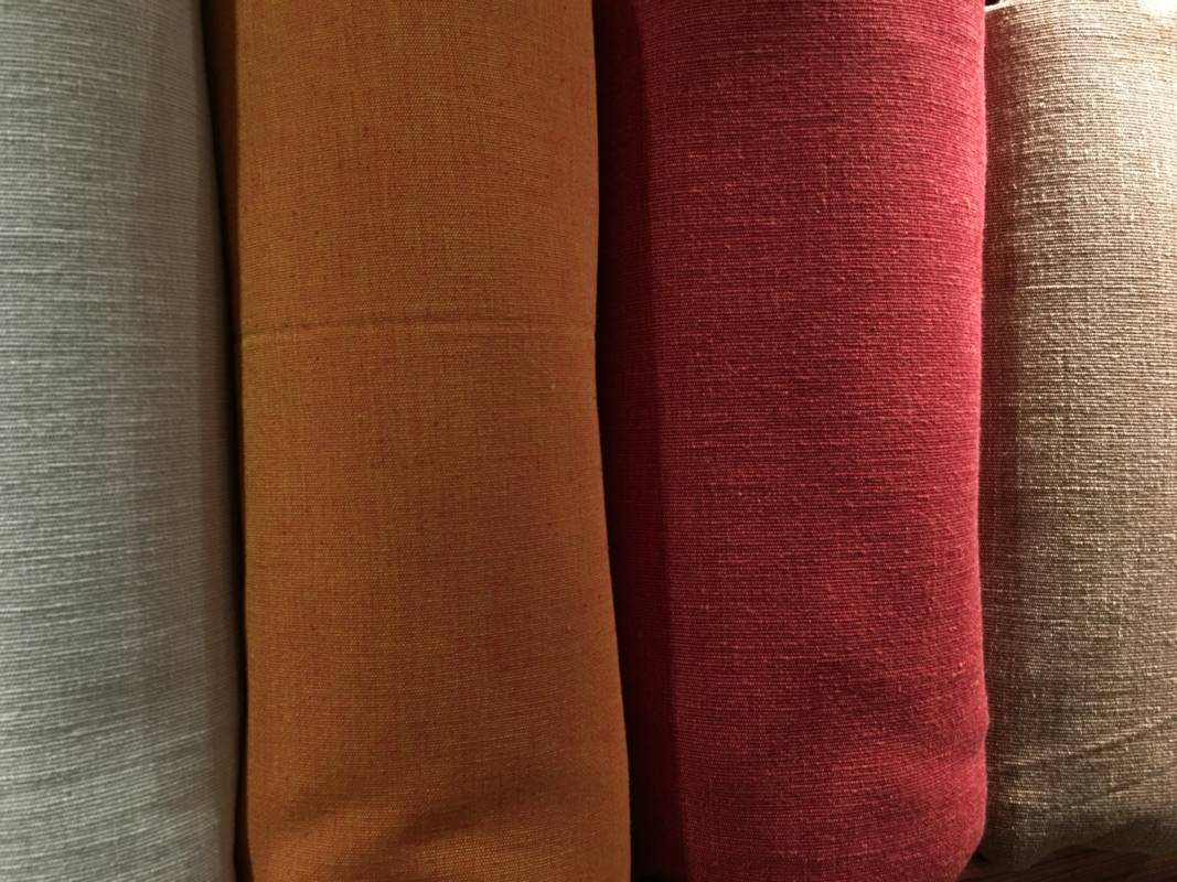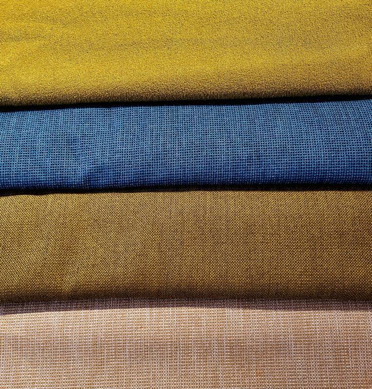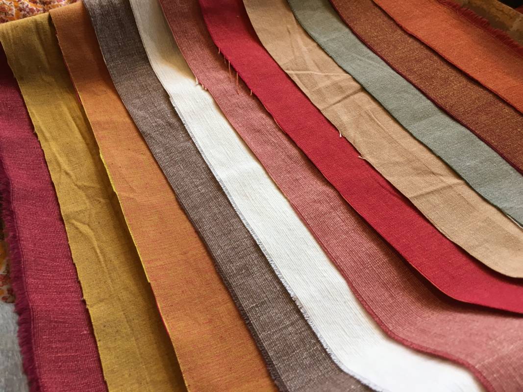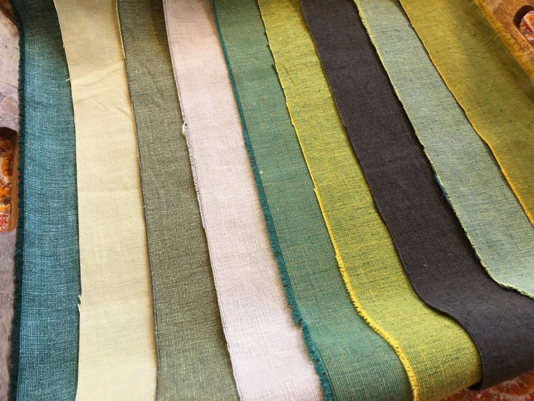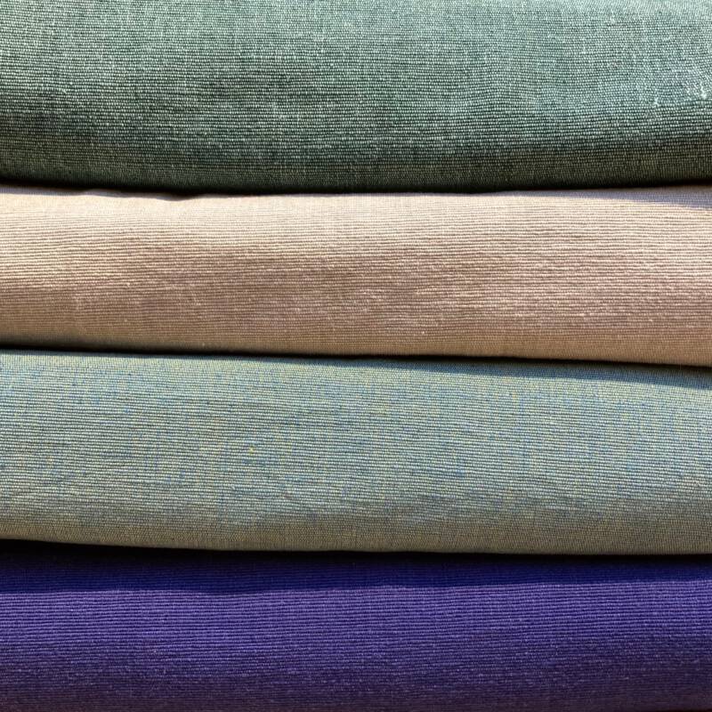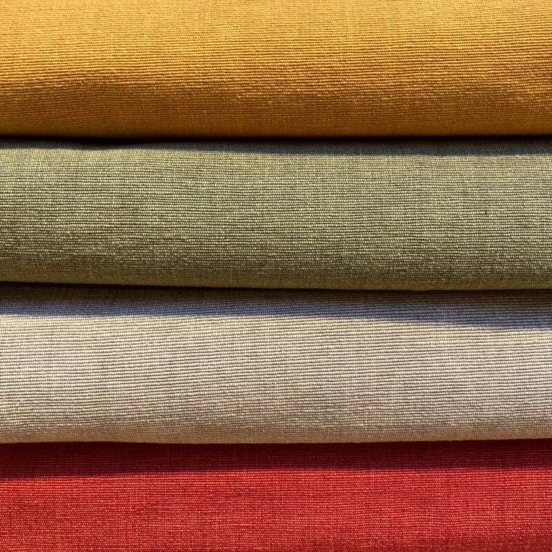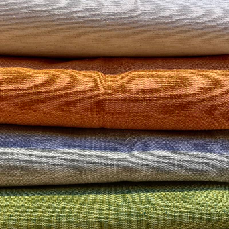 Onze kleurrijke handgeweven “effen” stoffen uit zuid India zijn beroemd bij de klanten. Gemaakt in Chennai, Tamil Nadu onder de vlag van Cooptex, een coorperatie van traditionele ”handloom weavers”, erkend en gekeurd door de regering van Tamil Nadu en de Indiase overheid. De stoffen zijn heel herkenbaar door de twee kleuren draden die gebruikt worden in één weving, hierdoor ontstaat een mooi changeant effect. Zo voegen zij zich qua kleur heel gemakkelijk in het interieur. Ze zijn geschikt voor het stofferen van meubelen, maar kunnen ook via een atelier bij ons tot gordijnen worden geconfectioneerd. Deze stoffen zijn 150 cm breed en kosten € 25,- per meter. De stoffen met een ingeweven strikje of oogje kosten € 27,50 per meter.