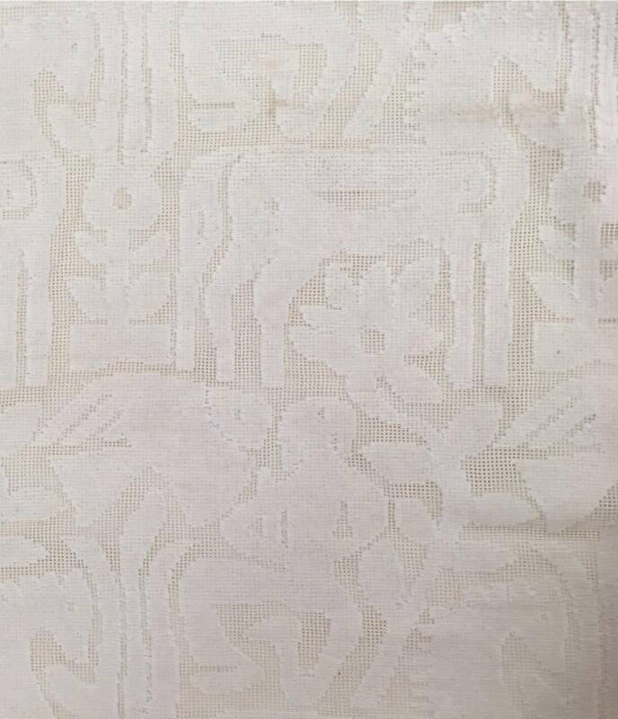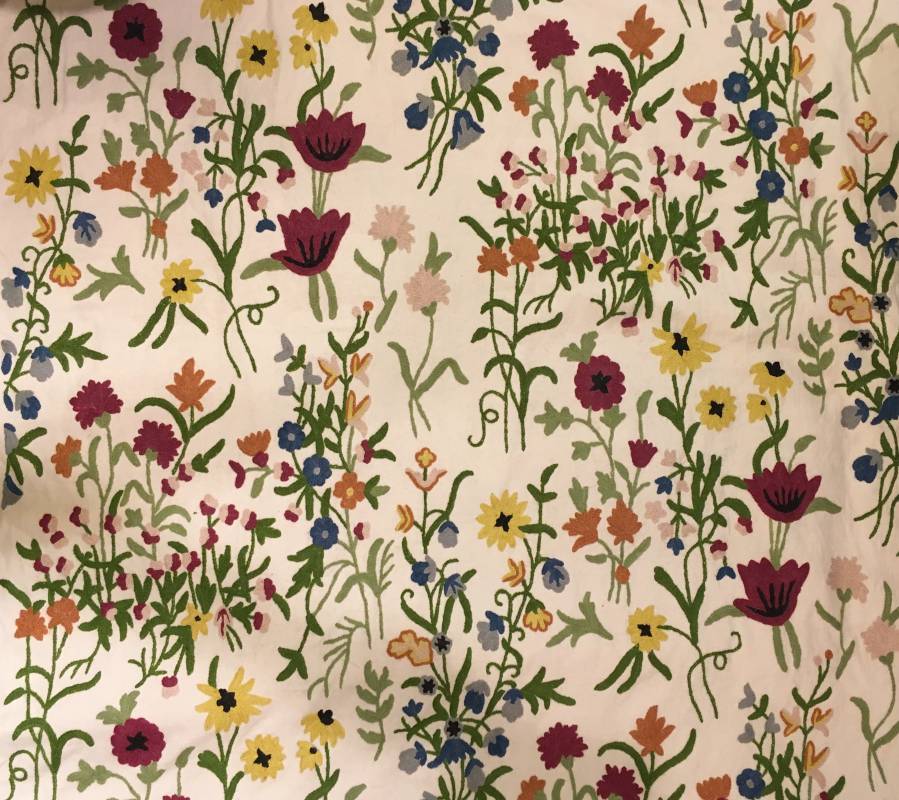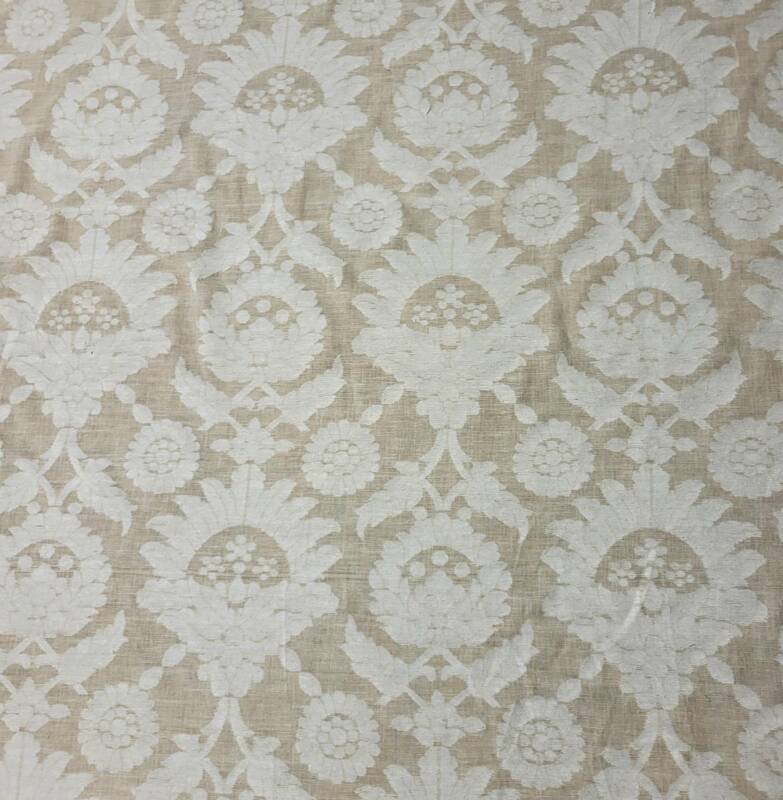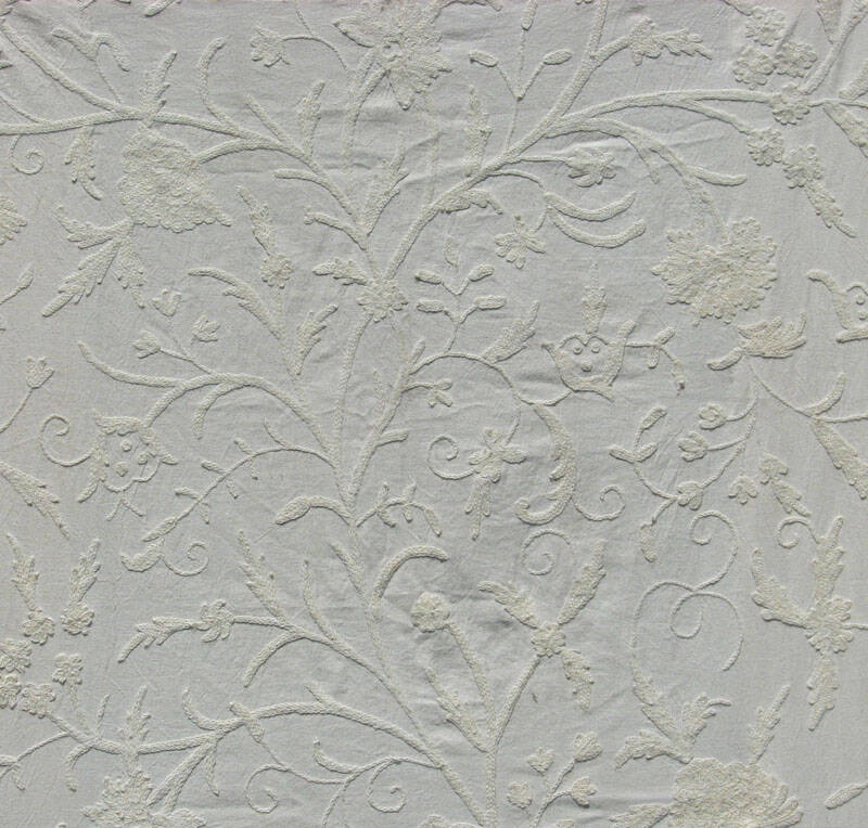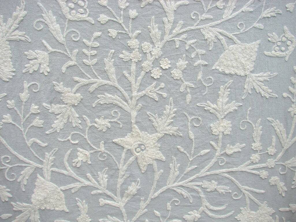 Het patroon met een sterretje* Yellow kost € 59,- per meter. ** De crewelstoffen op een linnen ondergrond, de WI 52 wit op wit kosten € 69,- per meter en zijn tevens 130 cm breed. *** De katoenen organza is 100 cm breed en kost € 59,- per meter. #Twee speciale crewels zijn de Eaton en Bird of Paradise, ze zijn met twee dunne draden voller geborduurd, deze techniek noemt men double ply. Heel mooi en verfijnd gemaakt, de prijs is € 85,- per meter. De laatste twee stoffen op een geverfde katoenen ondergrond kosten eveneens € 85,- per meter.