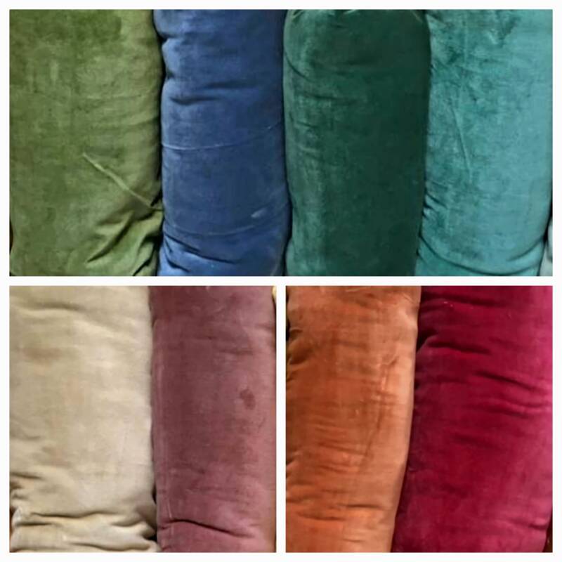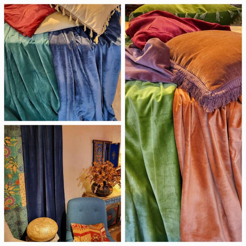 Sinds enige tijd verkopen wij ook handgeverfde katoenen fluwelen stoffen aan de meter. Dit fluweel valt zeer soepel en is daardoor uitstekend te gebruiken als gordijn. In meerdere kleuren en 140 cm breed, verkrijgbaar voor € 27,50 per meter.
